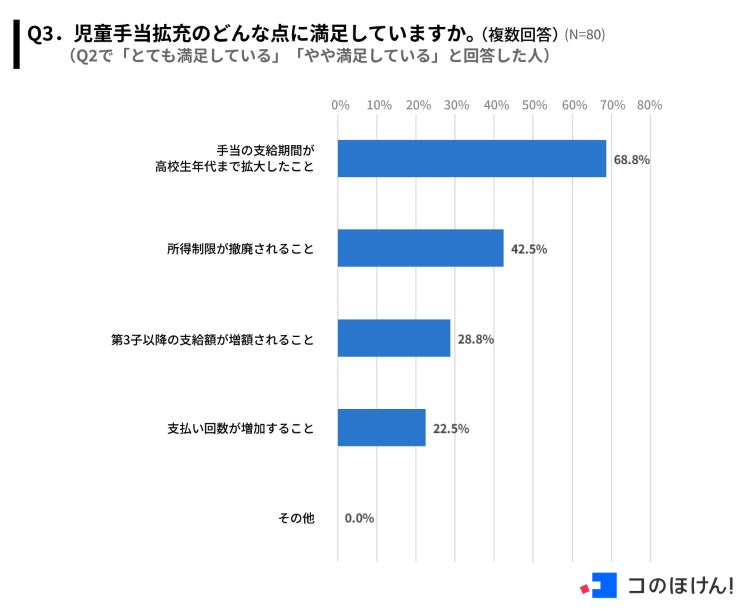 Q2で「とても満足している」「やや満足している」と回答した人に対し、「児童手当拡充のどんな点に満足していますか。(複数回答)」(N=80)と質問したところ、「手当の支給期間が高校生年代まで拡大したこと」が最多の68.8%、次いで「所得制限が撤廃されること」が42.5%、「第3子以降の支給額が増額されること」が28.8%という結果となりました。