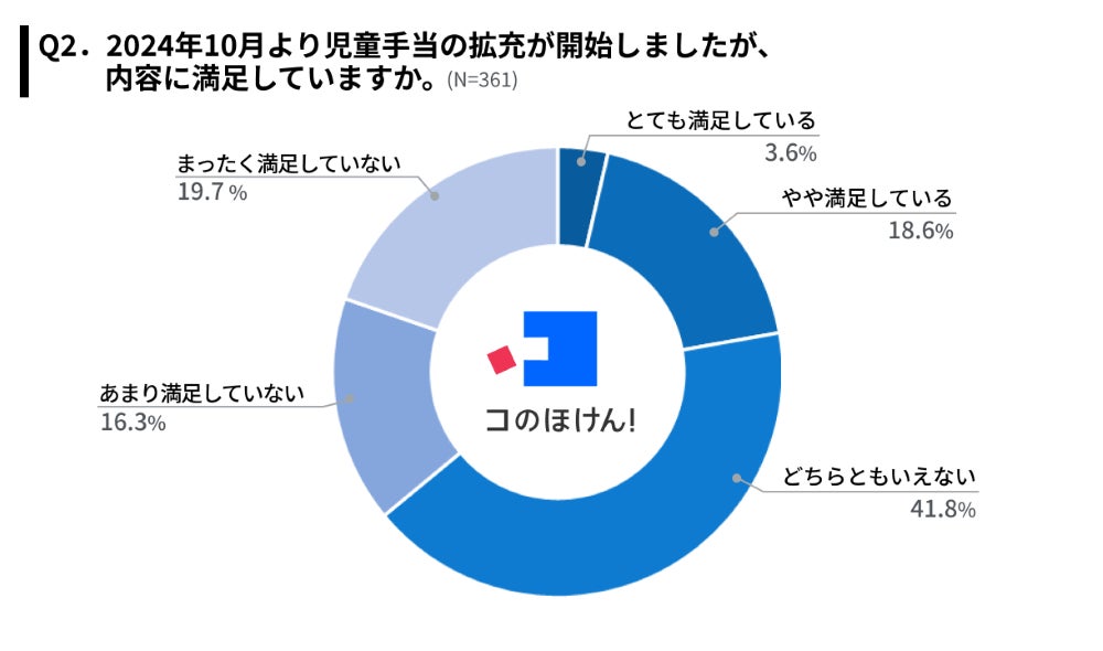 「2024年10月より児童手当の拡充が開始しましたが、内容に満足していますか。」(N=361)と質問したところ、「満足している」(「とても満足している」「やや満足している」の合計)が22.2%、「満足していない」(「あまり満足していない」「まったく満足していない」の合計)が36.0%、「どちらともいえない」が41.8%という結果となりました。
