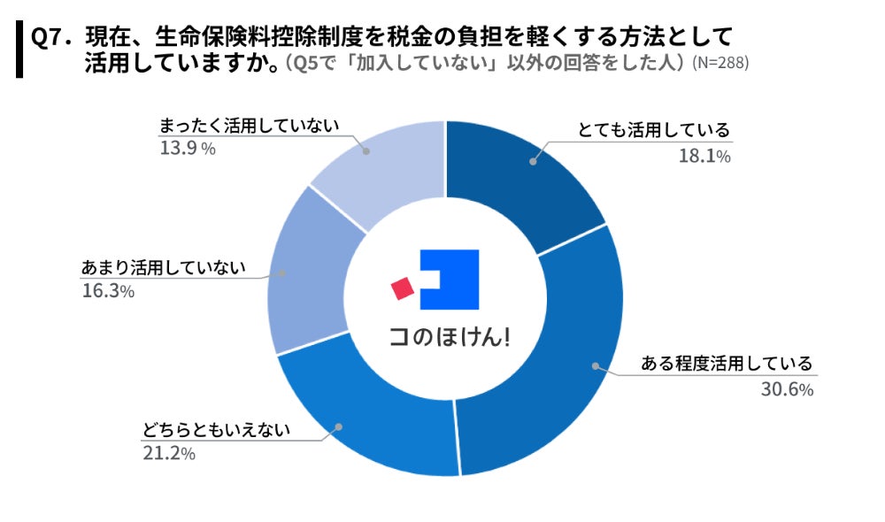 Q5で「加入していない」と回答した以外の人に対し、「現在、生命保険料控除制度を税金の負担を軽くする方法として活用していますか。」(N=288)と質問したところ、「活用している」(「とても活用している」「ある程度活用している」の合計)が48.7%、「活用していない」(「あまり活用していない」「まったく活用していない」の合計)が30.2%、「どちらともいえない」が21.2%という結果となりました。