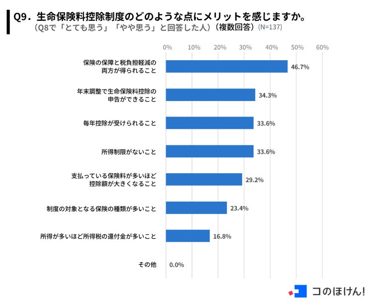 Q8で「とても思う」「やや思う」と回答した人に対し、「生命保険料控除制度のどのような点にメリットを感じますか。(複数回答)」(N=137)と質問したところ、「保険の保障と税負担軽減の両方が得られること」が最多の46.7%、次いで「年末調整で生命保険料控除の申告ができること」が34.3%、「毎年控除が受けられること」が33.6%という結果になりました。