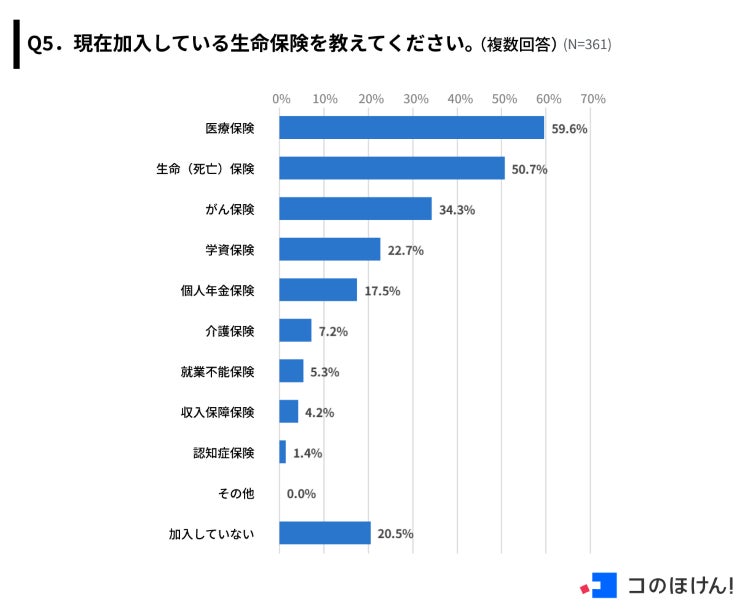 「現在加入している生命保険を教えてください。(複数回答)」と質問したところ、「医療保険」が最多の59.6%、次いで「生命(死亡)保険」が50.7%、「がん保険」が34.3%という結果になりました。