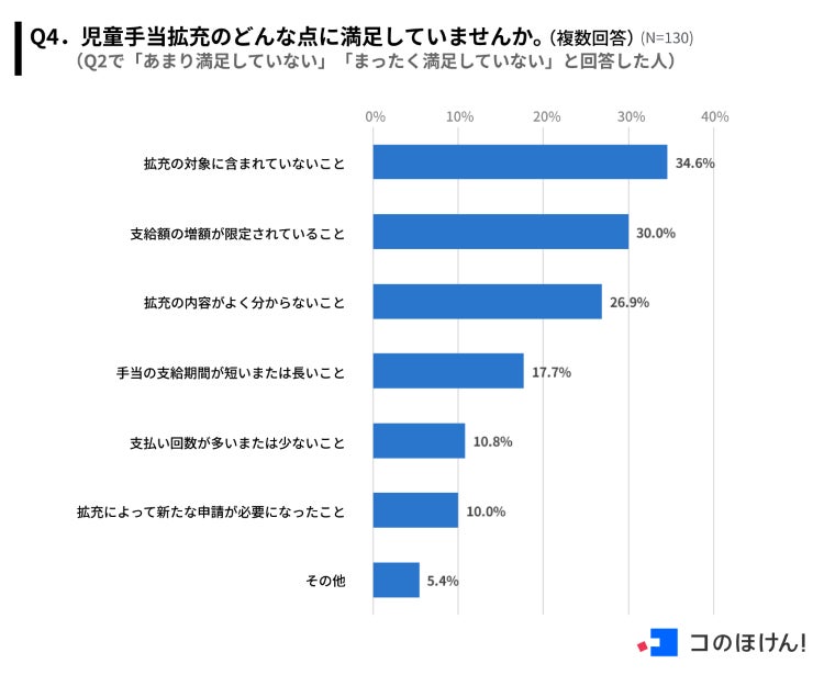 Q2で「あまり満足していない」「まったく満足していない」と回答した人に対し、「児童手当拡充のどんな点に満足していませんか。(複数回答)」(N=130)と質問したところ、「拡充の対象に含まれていないこと」が34.6%、「支給額の増額が限定されていること」が30.0%、「拡充の内容がよく分からないこと」が26.9%となりました。