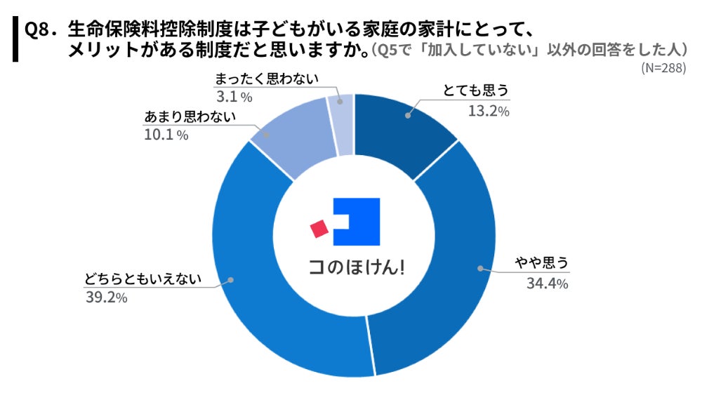 Q5で「加入していない」と回答した以外の人に対し、「生命保険料控除制度は子どもがいる家庭の家計にとって、メリットがある制度だと思いますか。」(N=288)と質問したところ、「思う」(「とても思う」「やや思う」の合計)が47.6%。「思わない」(「あまり思わない」「まったく思わない」の合計)が13.2%、「どちらともいえない」が39.2%という結果になりました。