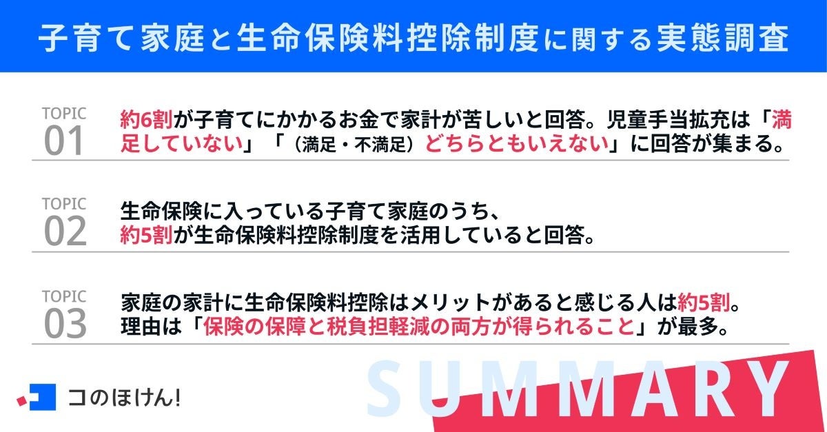 【子育て家庭の家計負担を調査】約6割が子育て費用で家計の苦しさを実感…税負担を軽くする生命保険料控除を活用している割合は?