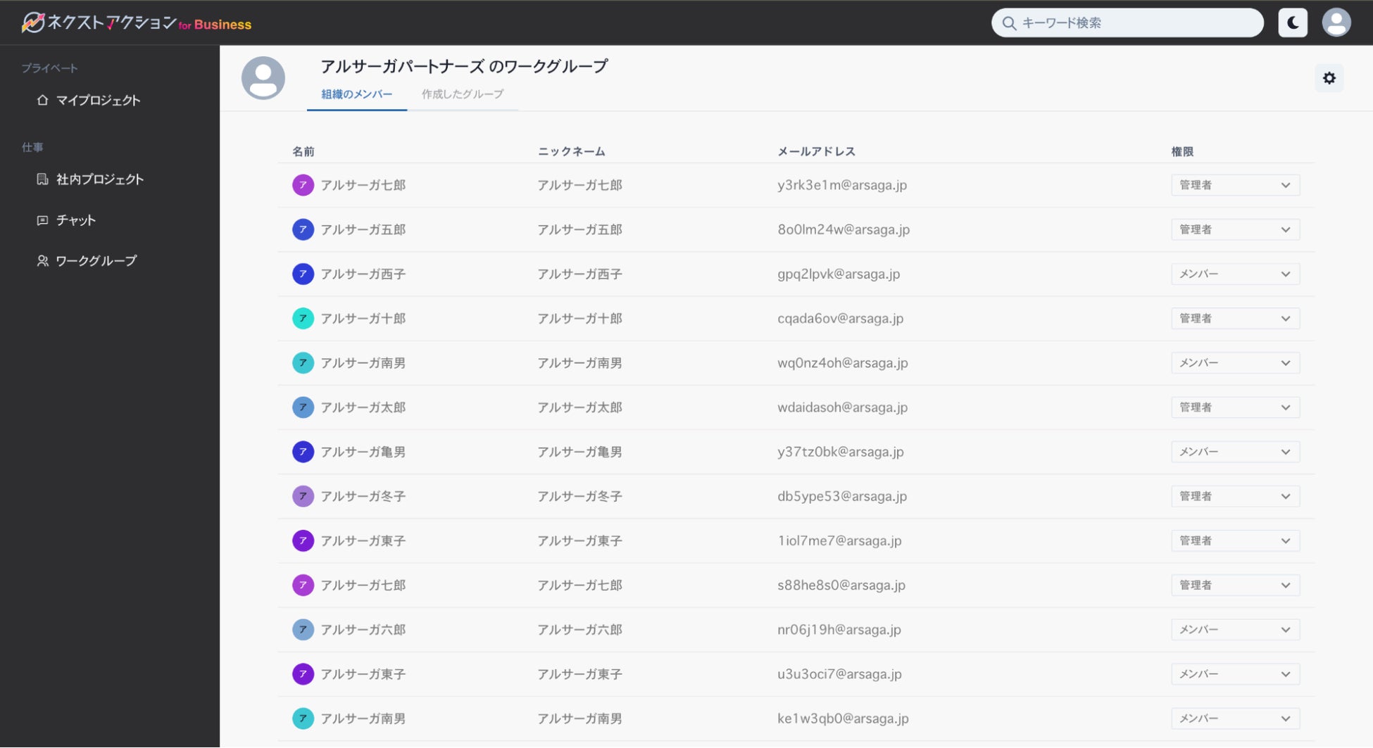 「ネクストアクション for Business」では、セキュリティ強化のため、組織ドメインでのログインのみ対応し、フリードメイン(例:gmail.com、yahoo.co.jp等)は利用できません。組織ドメインでログインすると、社内ワークグループが自動生成され、他組織への情報漏えいを防ぎます。toC版アカウントをお持ちの場合も、同じアドレスでログインすることで個人プロジェクトをシームレスに引き継げます。