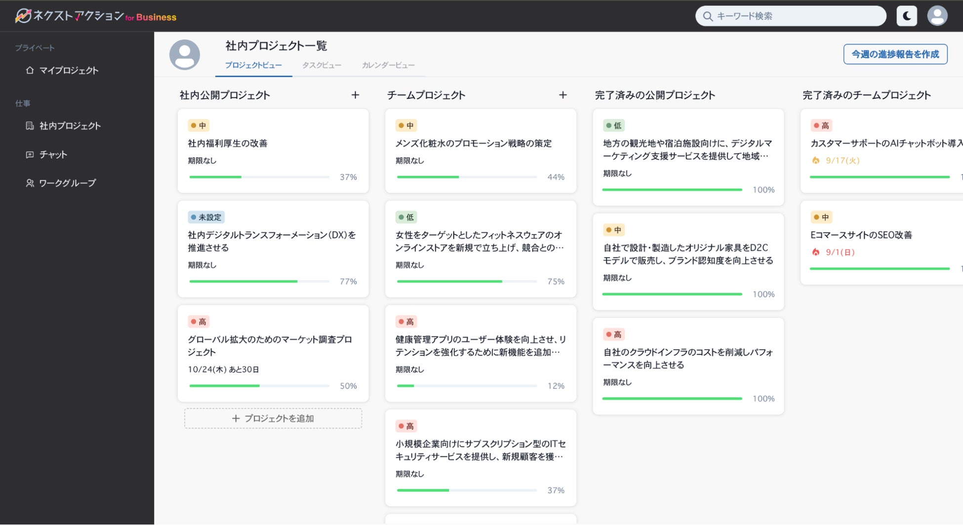 複数のプロジェクトを同時に管理する必要がある企業には、プロジェクトタスクの自動生成や進捗レポートの自動作成機能が有効です。