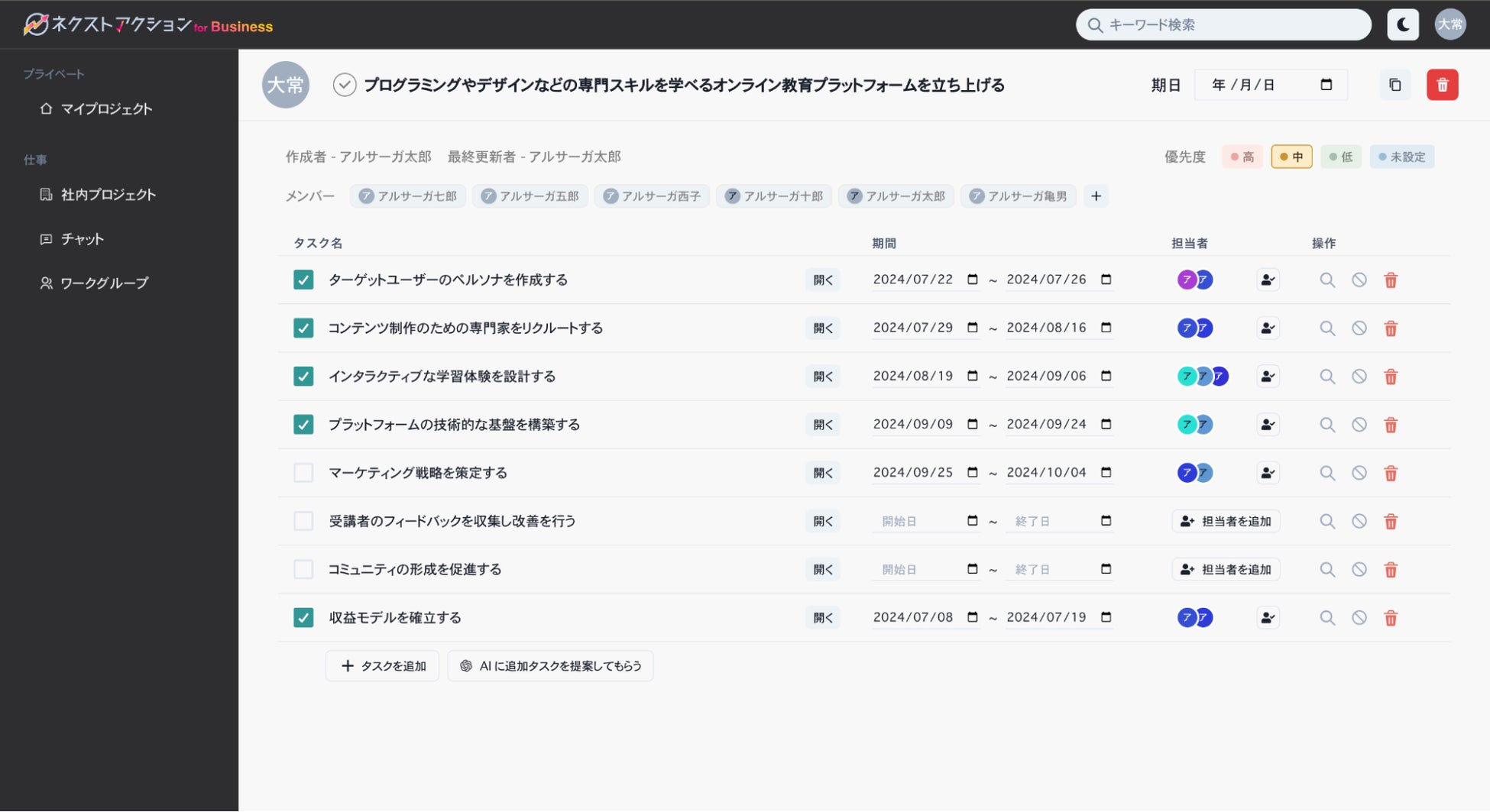 ビジネスアカウントを通じて、個人プロジェクトと社内プロジェクトの一元管理が可能です。プライベートとビジネスを明確に分けながらも、AIによるタスク生成機能を利用して、効率的に目標達成をサポートします。