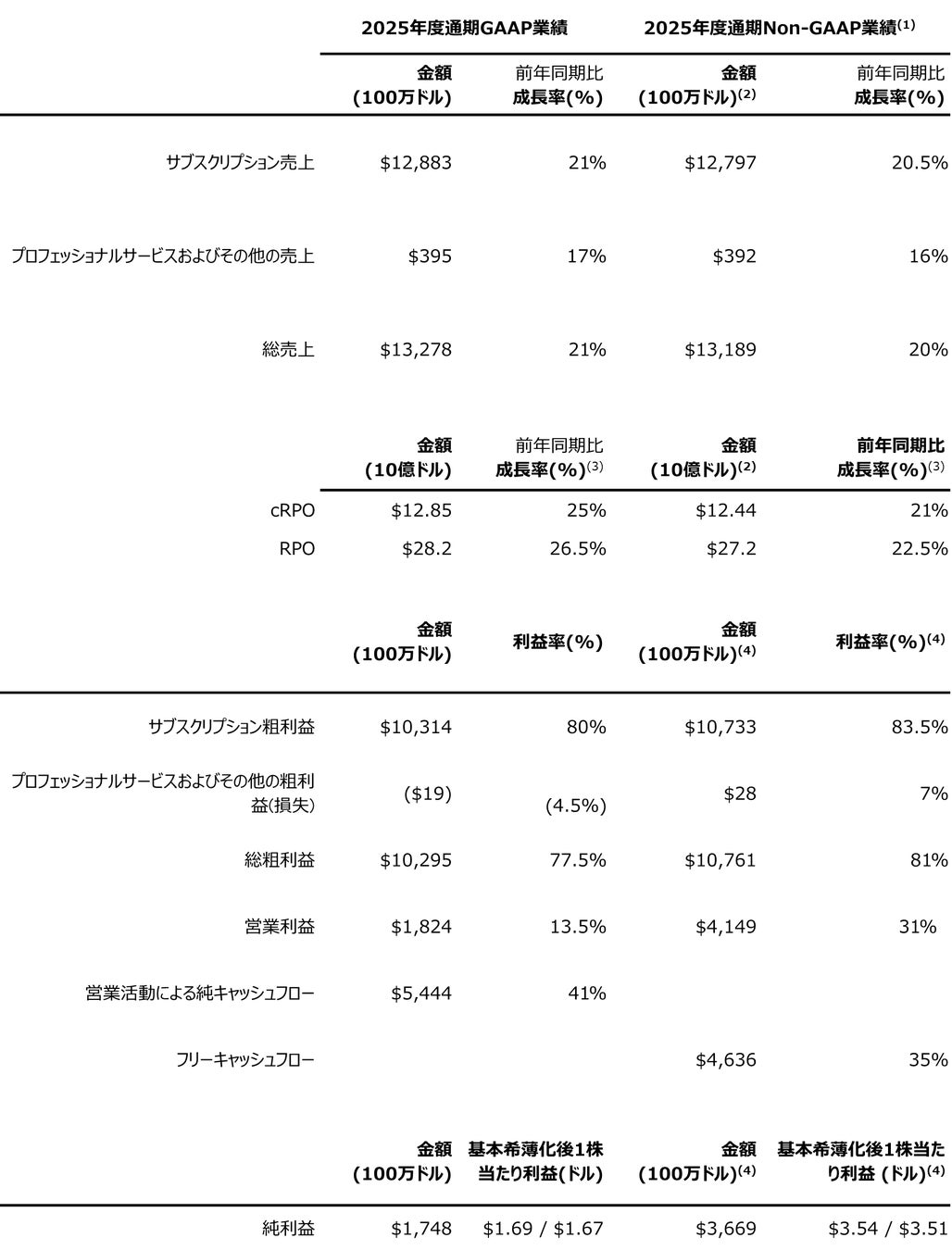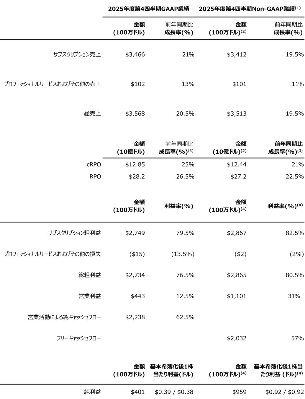 2025年第4四半期の当期残存履行義務(cRPO)は128.5億ドル、前年同期比25%増、為替変動の影響を除いた場合は21%増