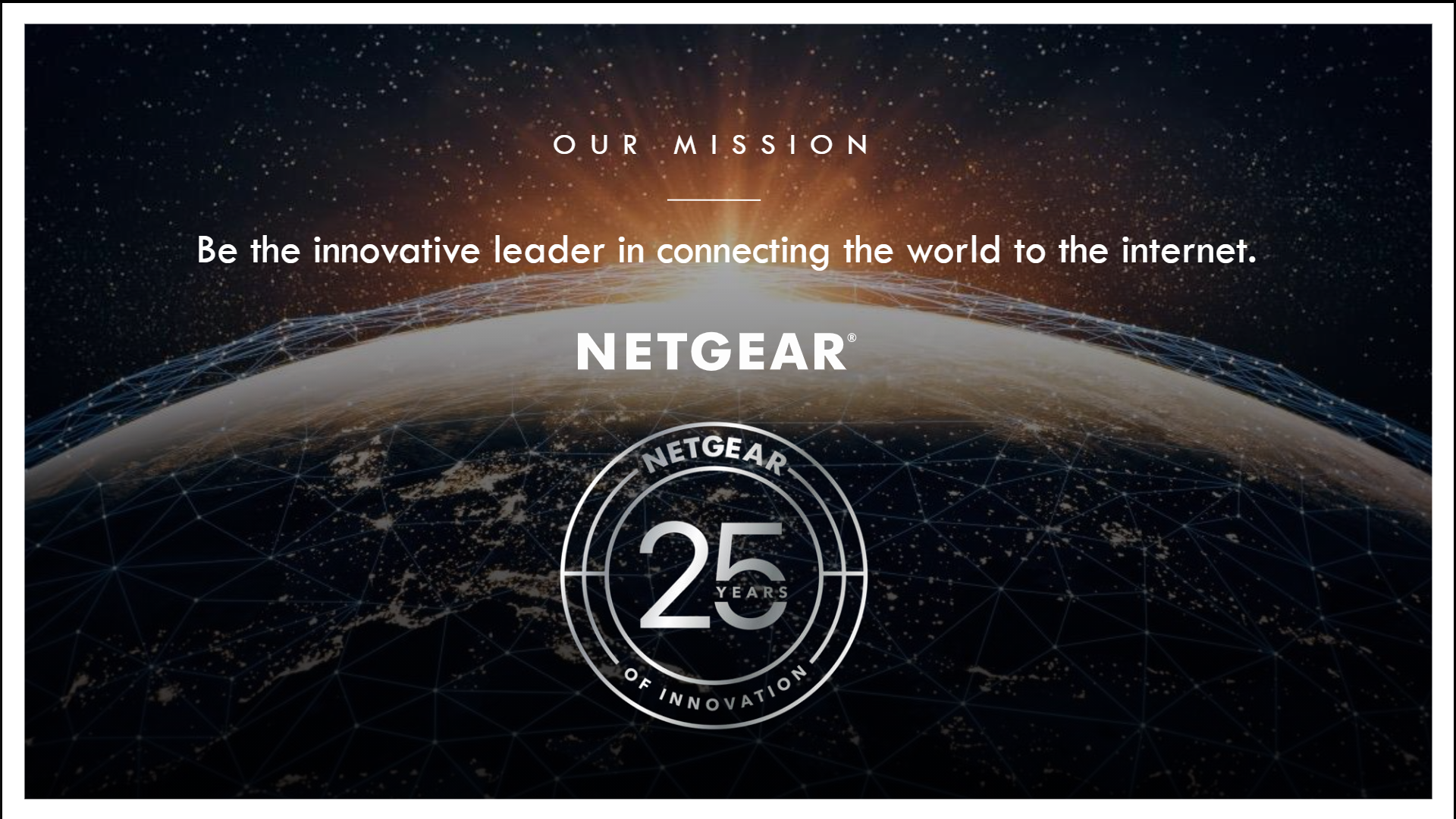 世界をインターネットにつなぐことにおいて、イノベーティブなリーダーであり続けることをミッションに、製品の開発、販売を行っているネットギアジャパンは、2021年1月に25周年を迎えることができました。これもひとえに皆様からの長年にわたるご愛顧の賜物と、心より感謝申し上げます。グローバルネットワークメーカー、NETGEAR, Inc.の日本法人として設立され25年、今後もホーム/ビジネス向けに高性能で使いやすいネットワーク製品を日本中のお客様にお届けしてまいります。