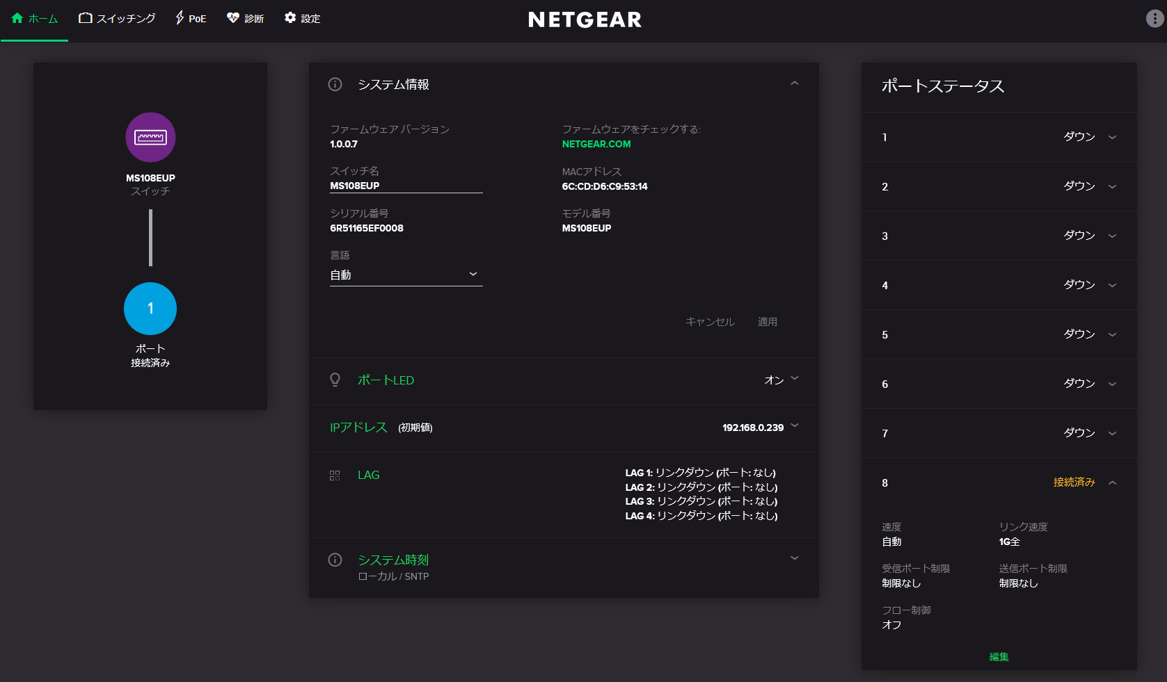 - 電源サイクルポート: PoE給電ポートを強制的にリセットします。