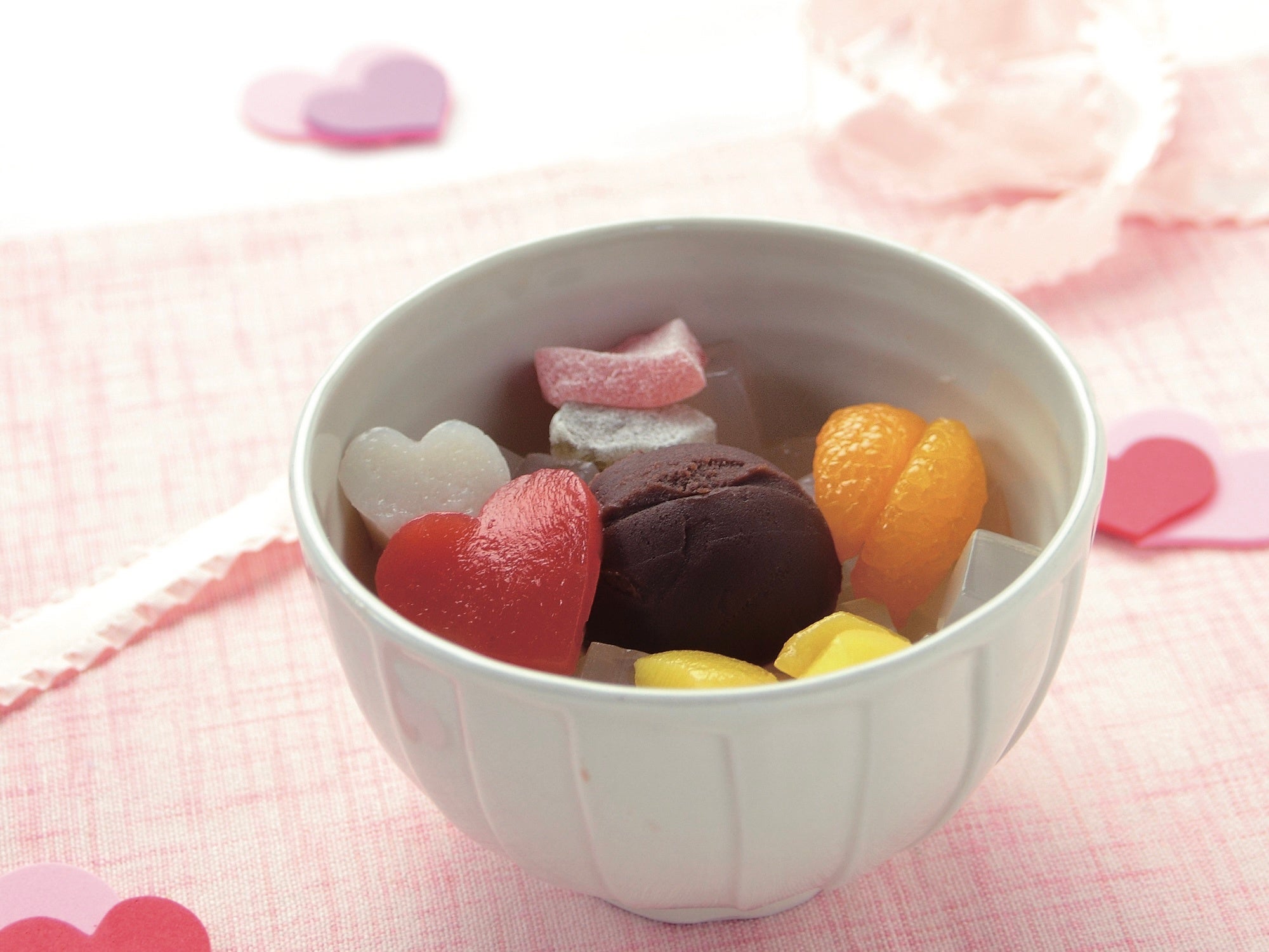 【内容】寒天、チョコレート餡、求肥、ハート型苺寒天、ハート型くず餅、赤えんどう豆、みかん、黄桃