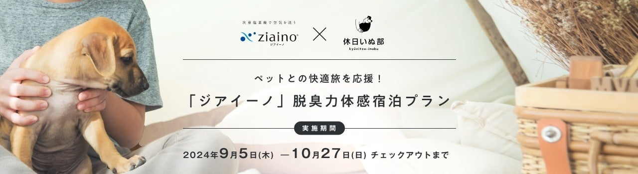 内容:人気旅行エリア4カ所のペットと同伴が可能な宿泊施設にて、『ペットとの快適旅を応援!「ジアイーノ」脱臭力体感宿泊プラン』を「休日いぬ部」で販売。客室やロビーに「ジアイーノ」が設置され、お客様はニオイが軽減された空間で、大切なペットと快適な時間を過ごすことができます。更に「ジアイーノ」を体感して、アンケートにご回答いただいた方限定で、抽選で5,000円分のギフトカードが当たるキャンペーンも実施します。