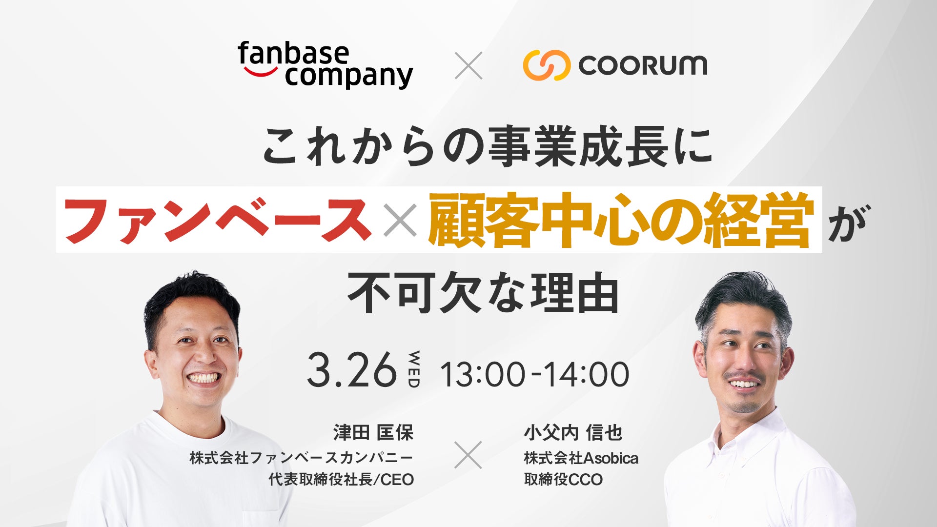 株式会社Asobica(本社所在地:東京都品川区、代表取締役CEO:今田 孝哉)は、株式会社ファンベースカンパニー(東京都渋谷区、代表取締役社長/CEO:津田匡保)と共催し、3月26日(水)13時より、「これからの事業成長に『ファンベース×顧客中心の経営』が不可欠な理由」をテーマとしたウェビナーを開催します。