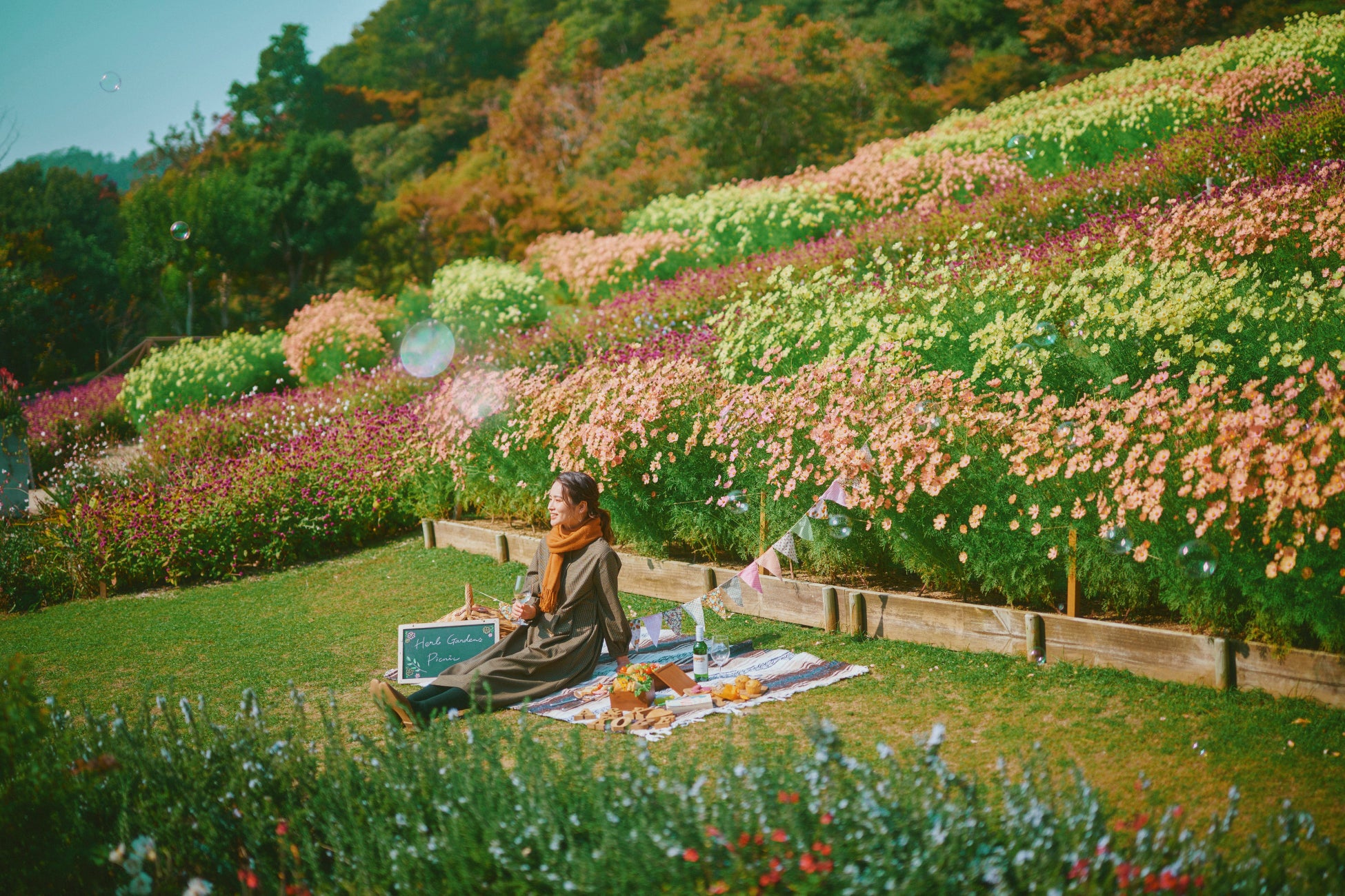 春、秋の大人気企画「ガーデンピクニック」。ピクニックに欠かせないフードやスイーツ、ドリンク、レジャーシート、カッティングボード、カトラリーセットなどをまとめてレンタル。ピクニックを演出するドライフラワーやガーランド、アルファベットオブジェ、黒板、シャボン玉などもセットになっているため、手ぶらでワンランク上の「おしゃピク」をお楽しみいただけます。「上質な過ごし方」をテーマに、神戸布引ハーブ園ならではの自然空間を利用したロケーションをご用意しています。特別なピクニックをお楽しみください