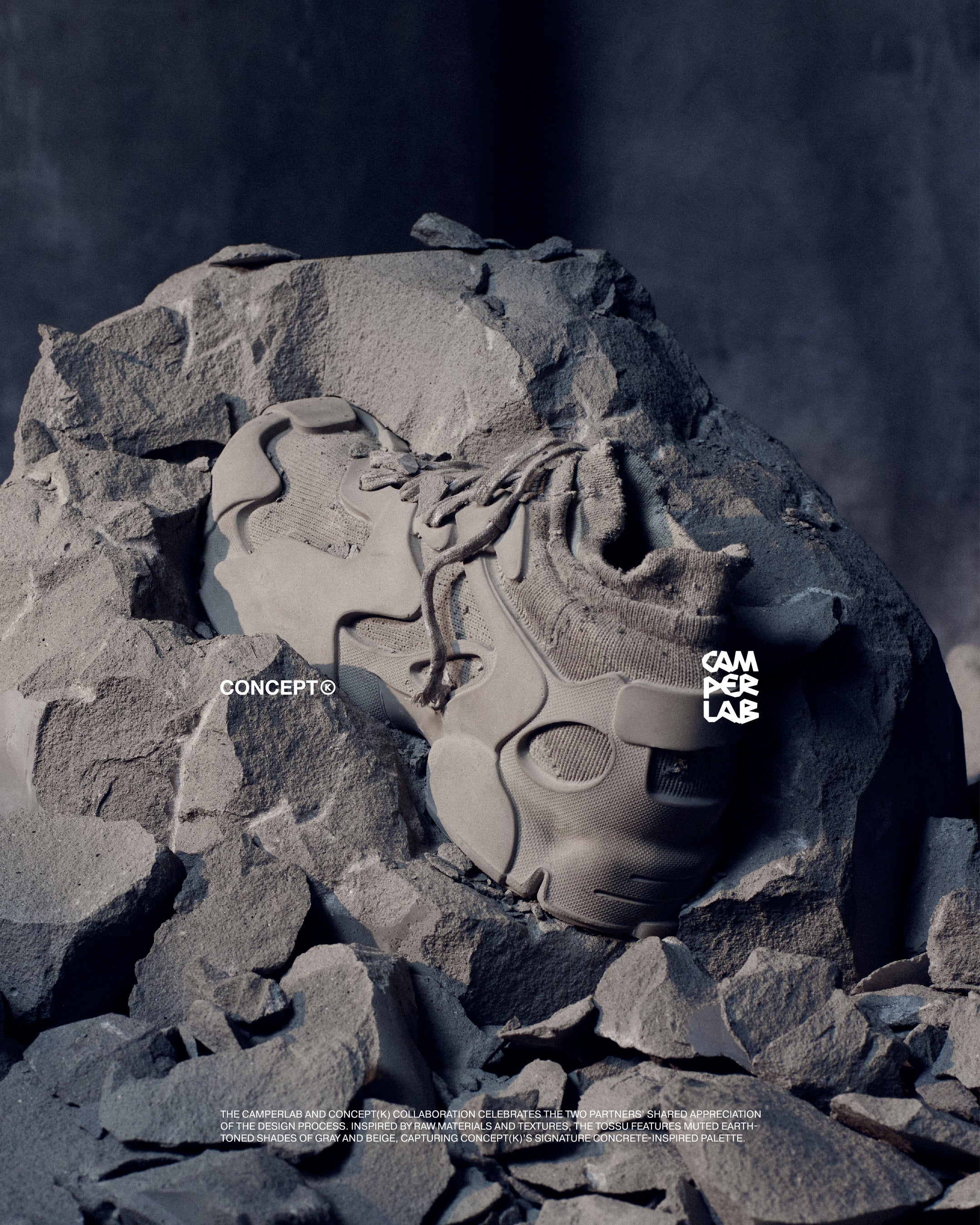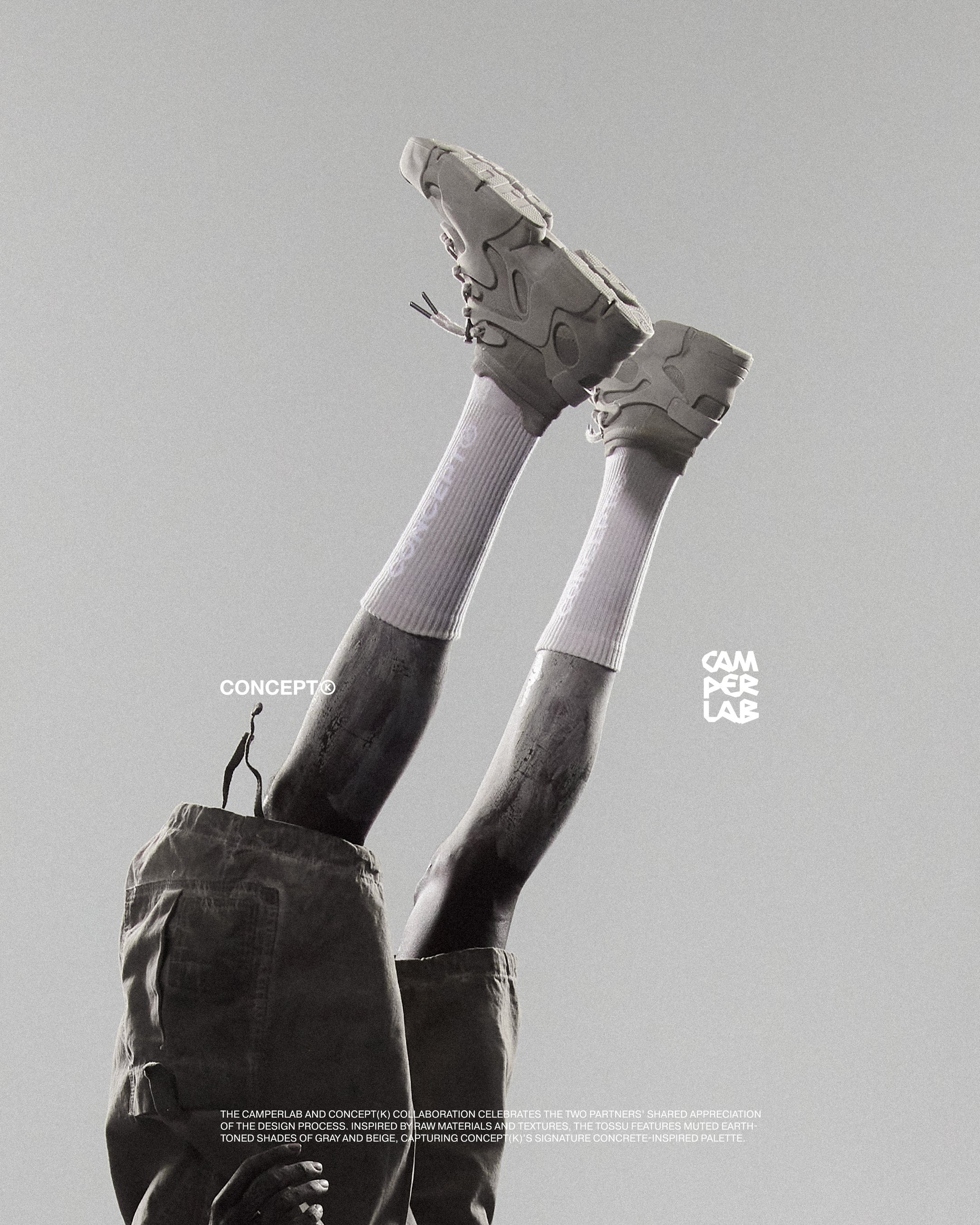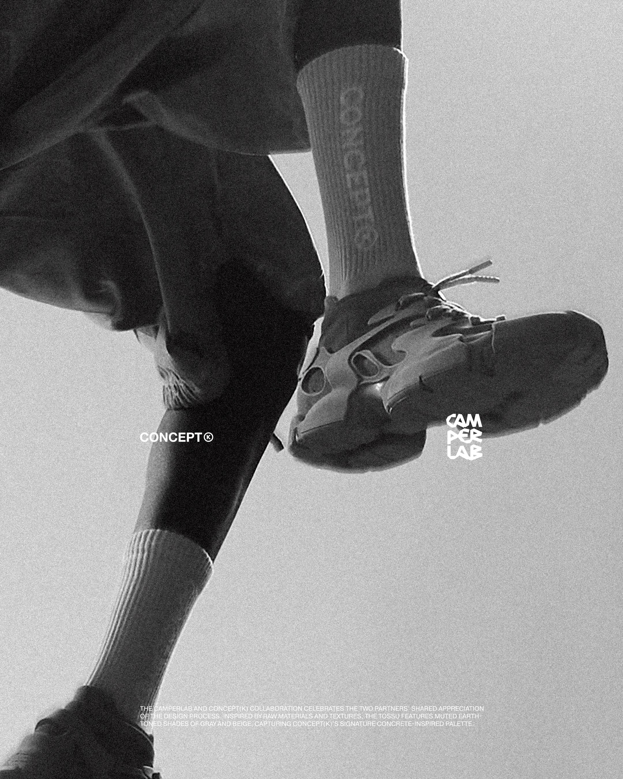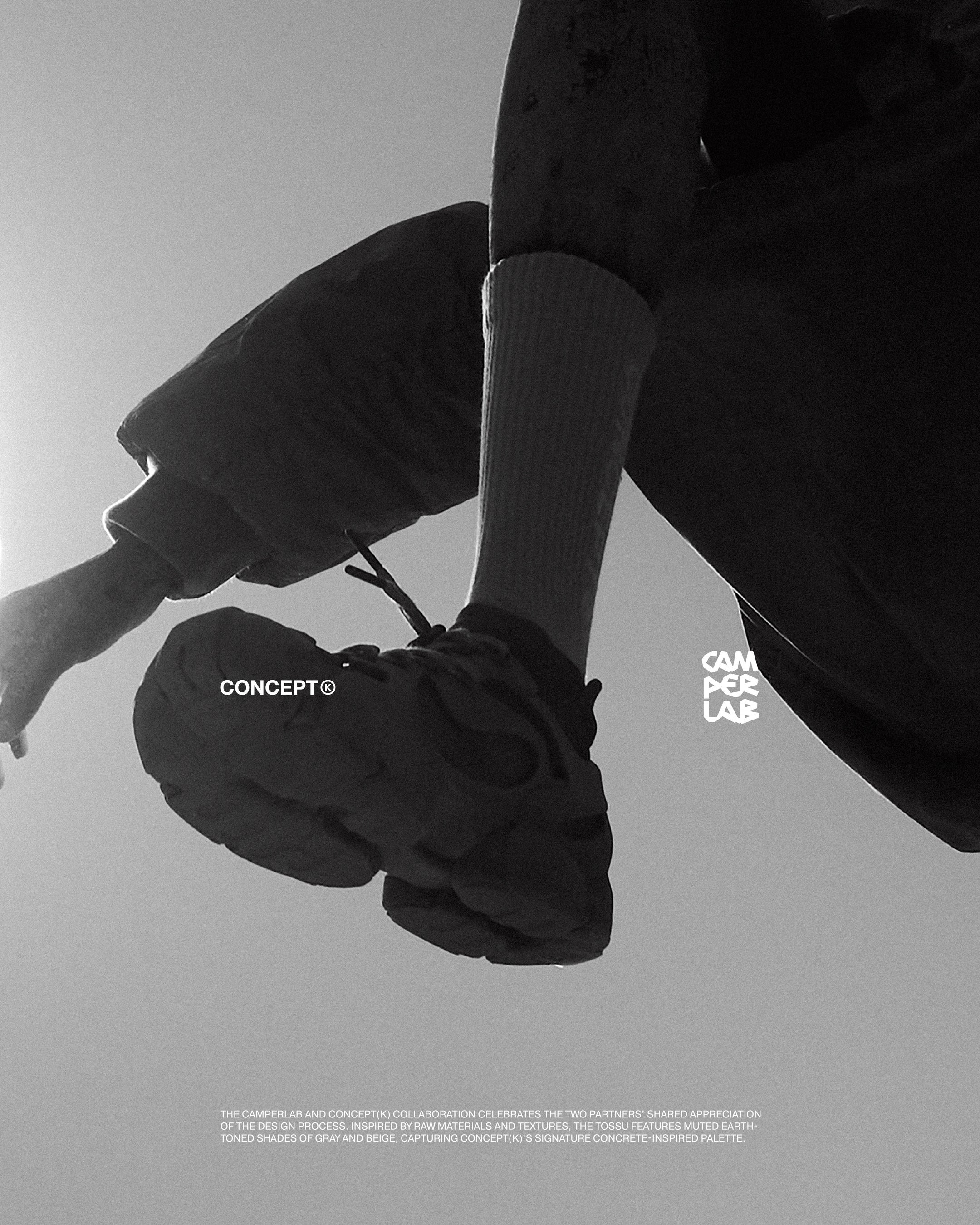 今回のプロジェクトに際し、CAMPERLABとCONCEPT(K)は、それぞれのデザイン理念を融合させ、無骨な素材とテクスチャーにインスパイアされた新しいTOSSUを誕生させました。グレーとベージュのアースカラーを基調とした落ち着いた色合いの「CAMPERLAB by CONCEPT(K) Stone Grey Tossu」は、コンクリートを彷彿とさせるCONCEPT(K)の象徴的なパレットであり、多様な要素を一体化させるという哲学を体現しています。