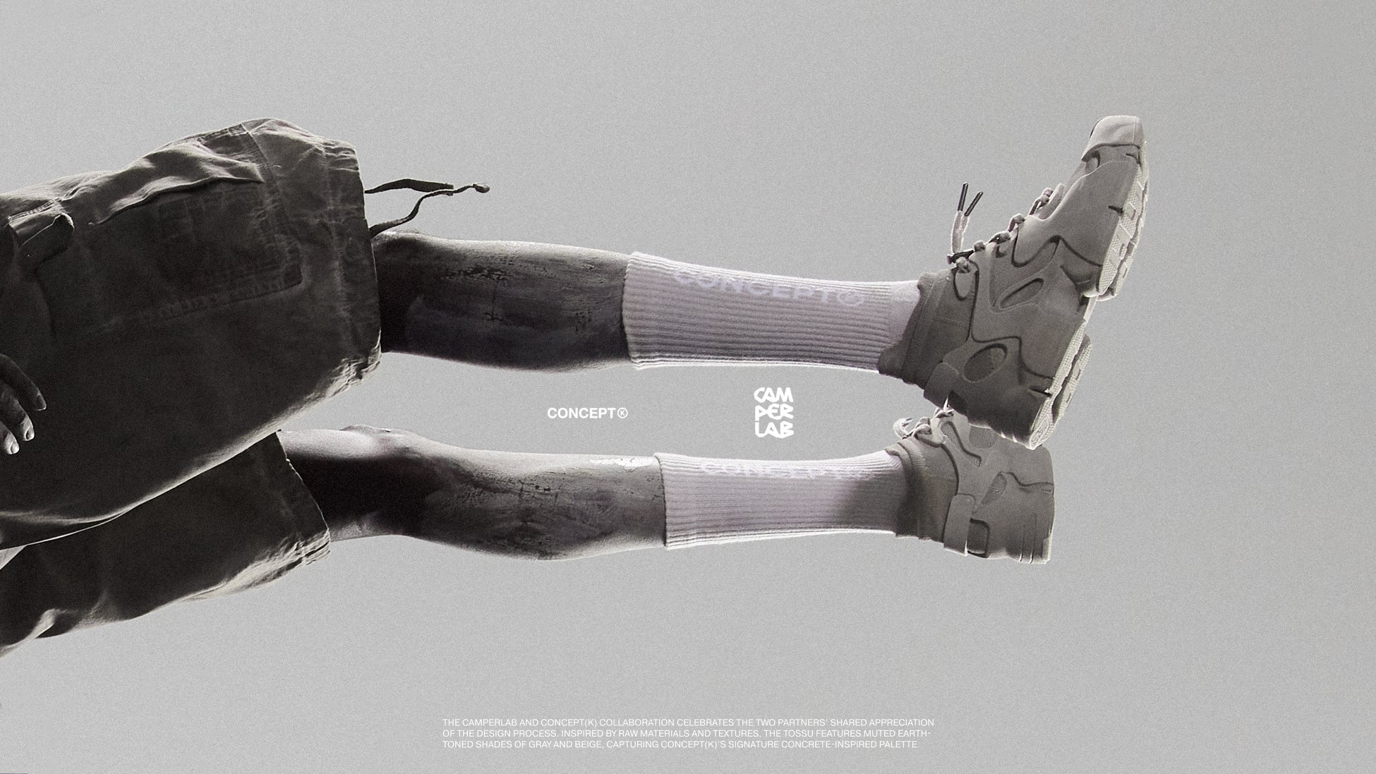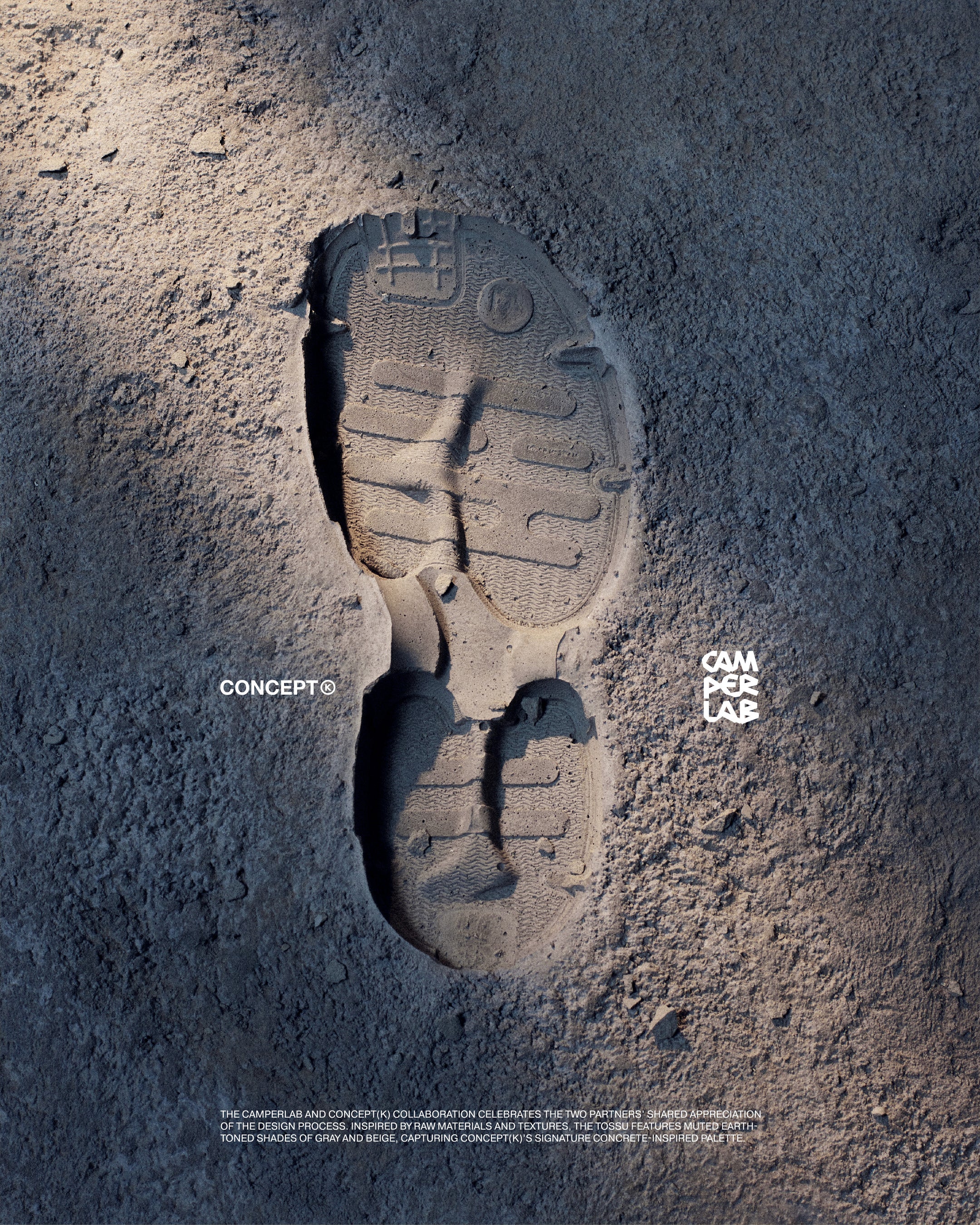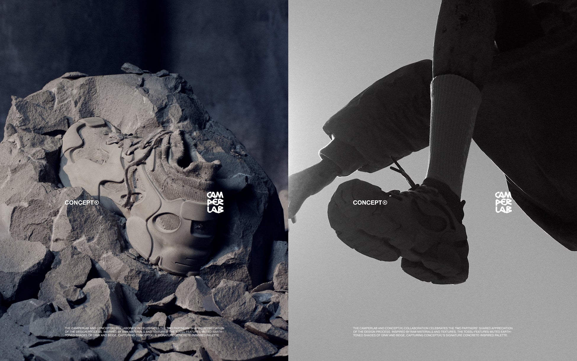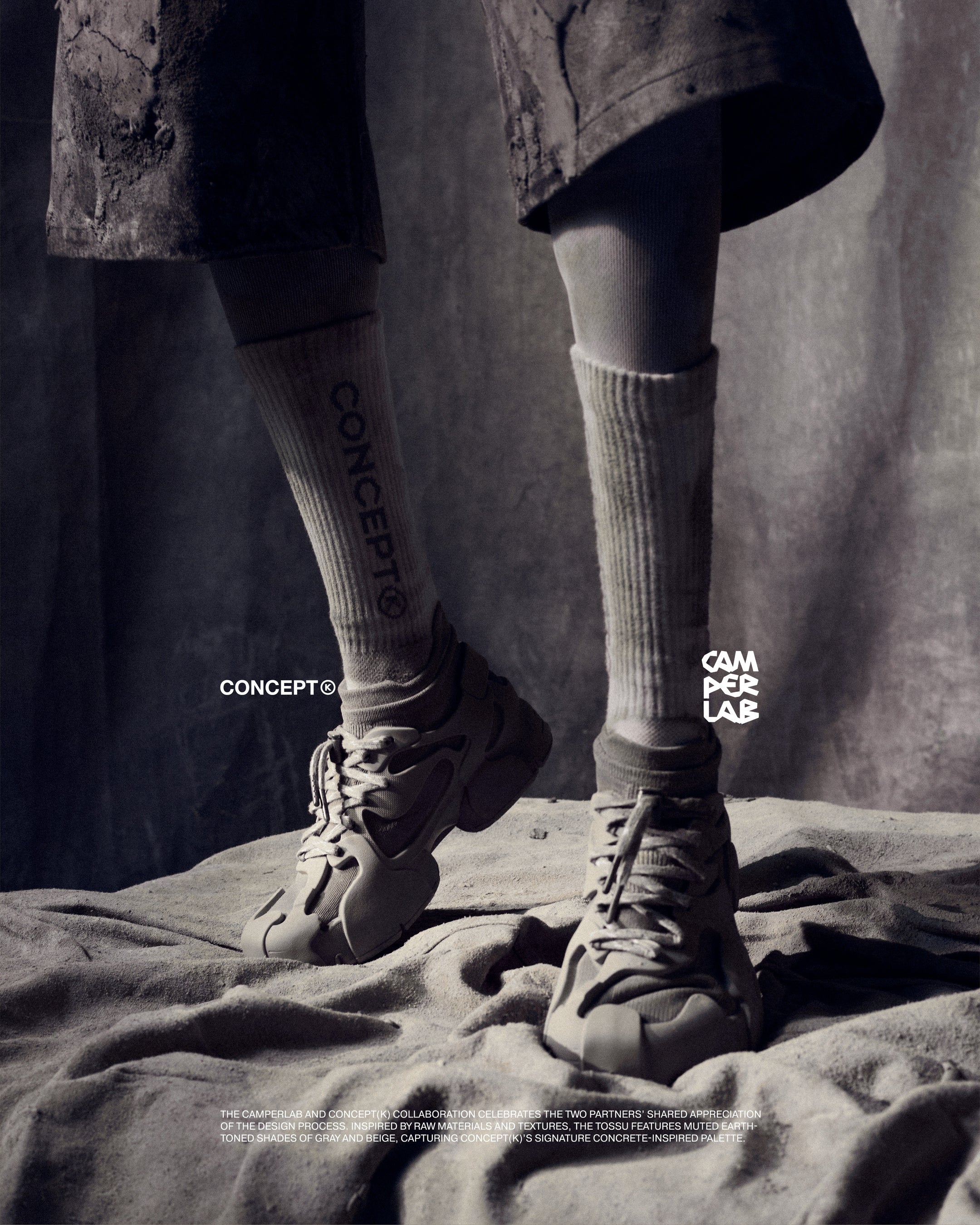 今回のプロジェクトに際し、CAMPERLABとCONCEPT(K)は、それぞれのデザイン理念を融合させ、無骨な素材とテクスチャーにインスパイアされた新しいTOSSUを誕生させました。グレーとベージュのアースカラーを基調とした落ち着いた色合いの「CAMPERLAB by CONCEPT(K) Stone Grey Tossu」は、コンクリートを彷彿とさせるCONCEPT(K)の象徴的なパレットであり、多様な要素を一体化させるという哲学を体現しています。