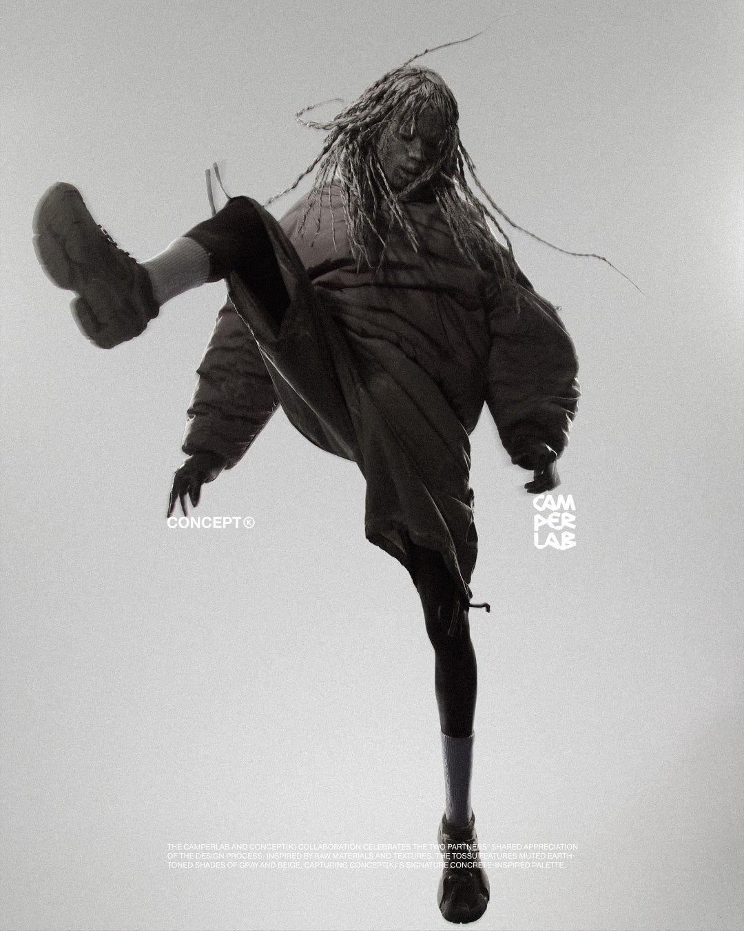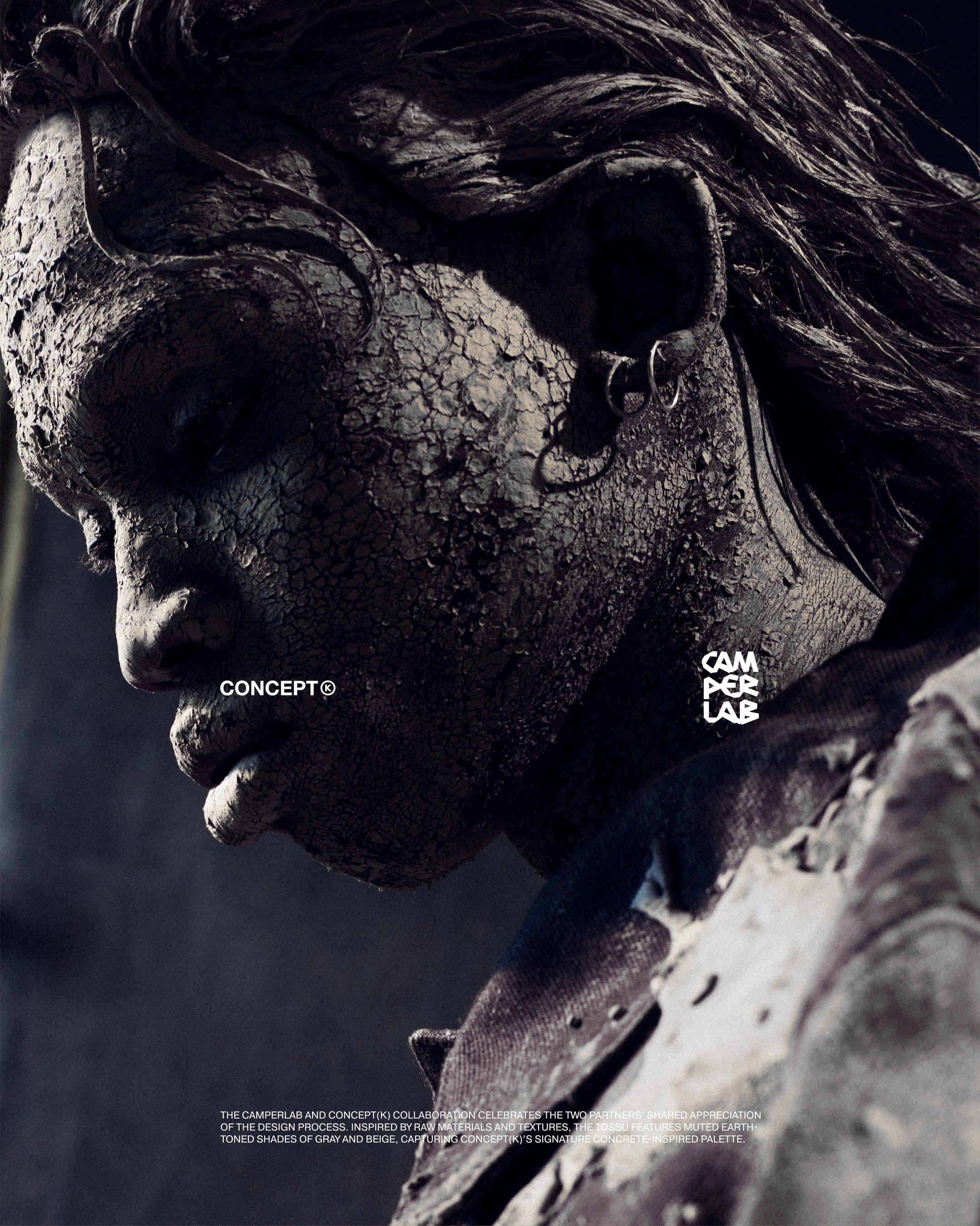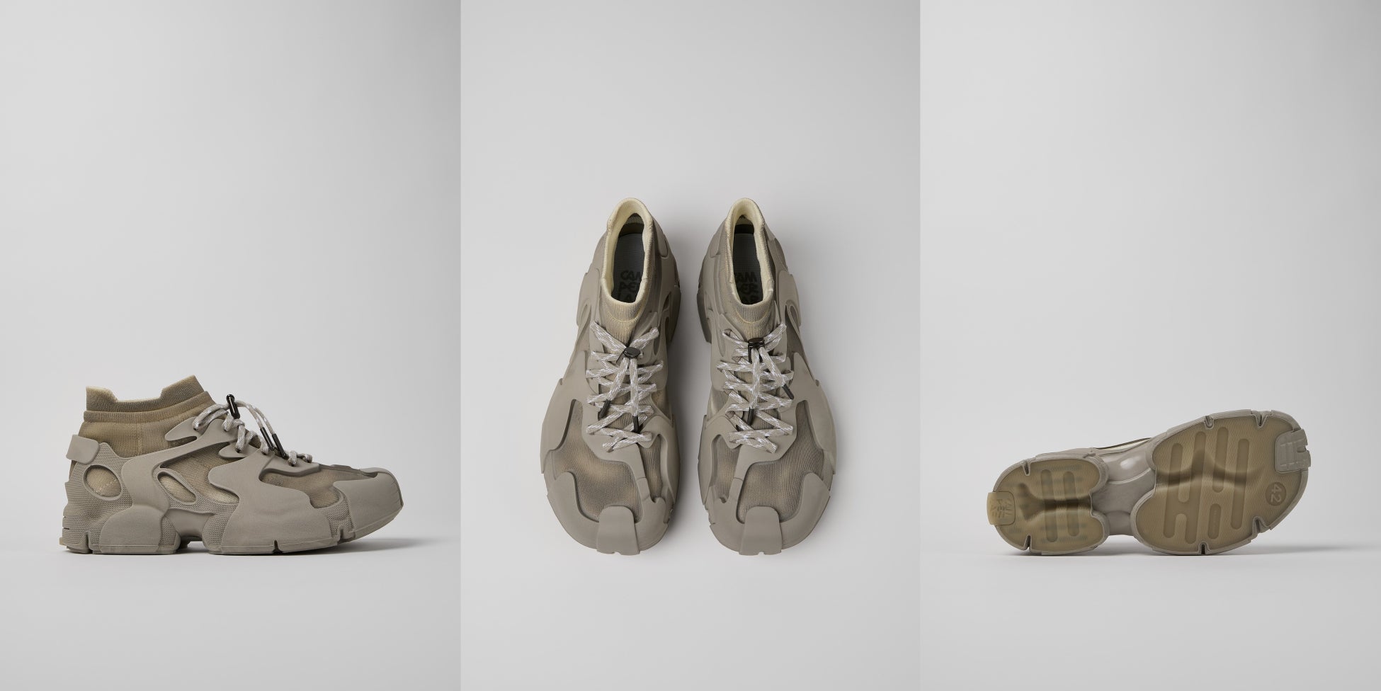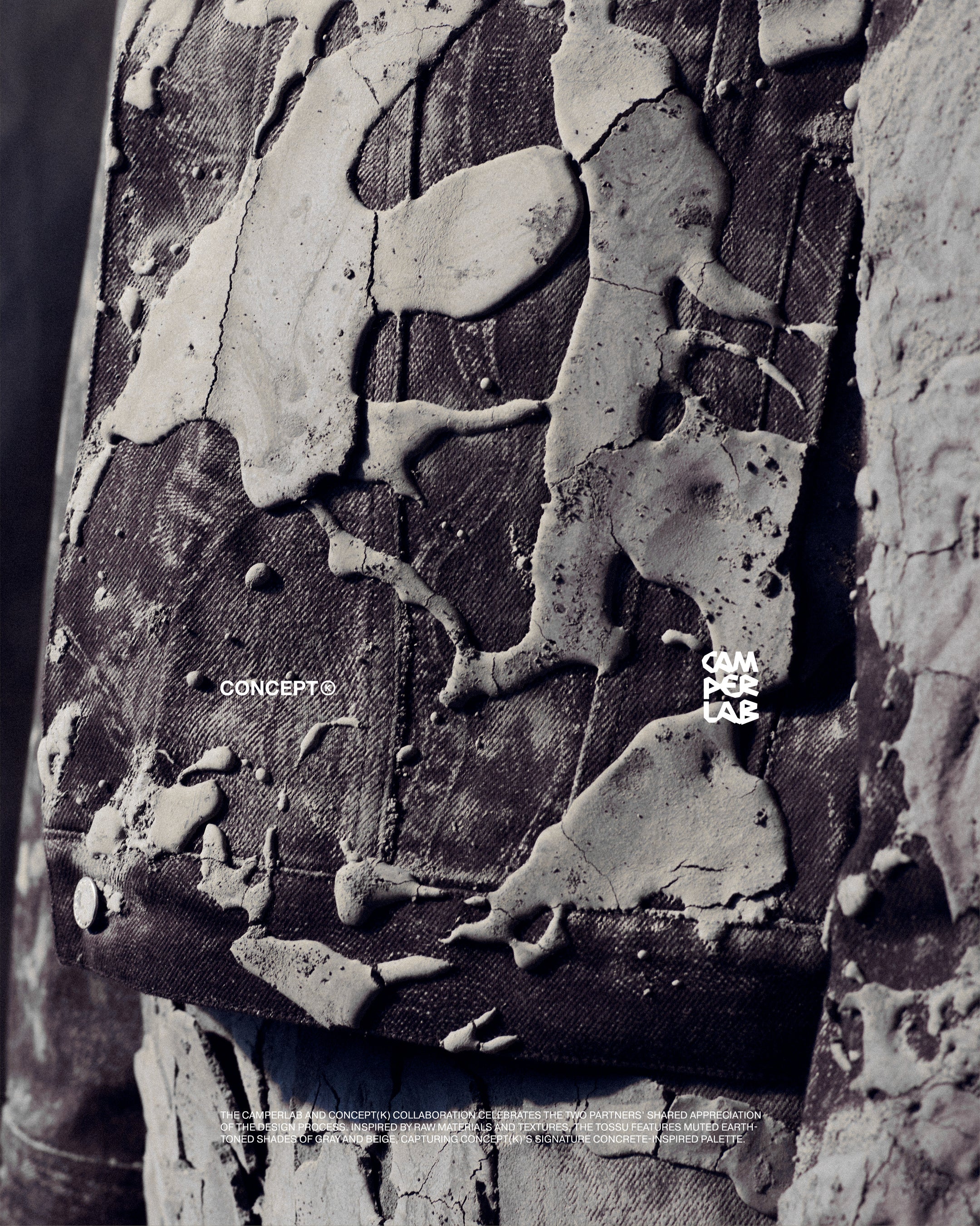 今回のプロジェクトに際し、CAMPERLABとCONCEPT(K)は、それぞれのデザイン理念を融合させ、無骨な素材とテクスチャーにインスパイアされた新しいTOSSUを誕生させました。グレーとベージュのアースカラーを基調とした落ち着いた色合いの「CAMPERLAB by CONCEPT(K) Stone Grey Tossu」は、コンクリートを彷彿とさせるCONCEPT(K)の象徴的なパレットであり、多様な要素を一体化させるという哲学を体現しています。