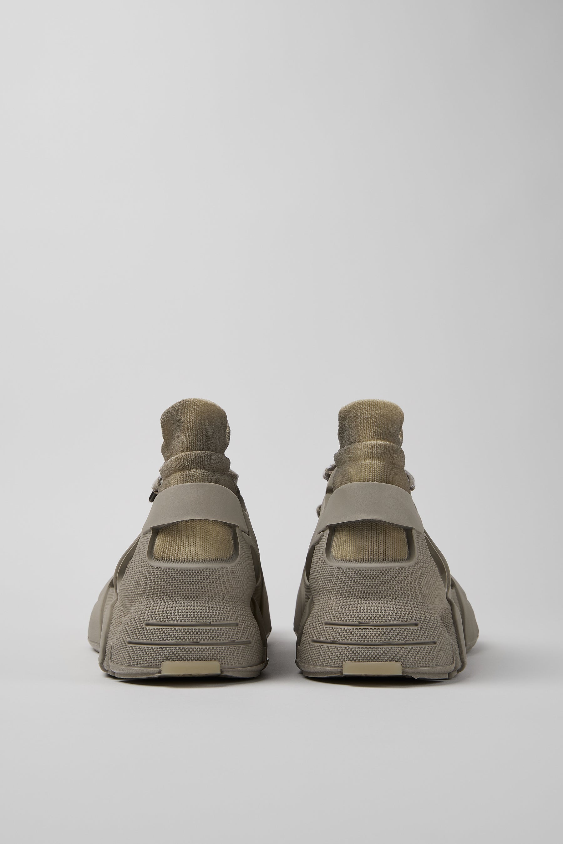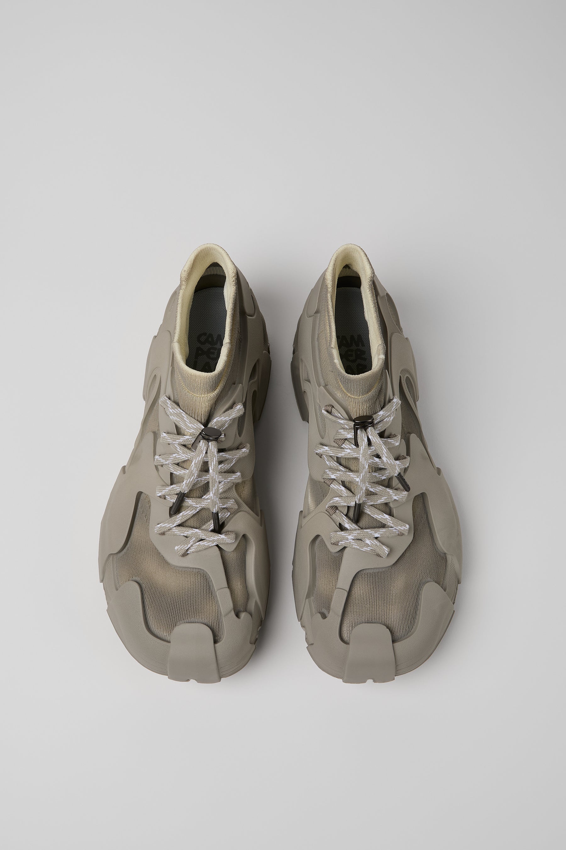 CAMPERLABの「TOSSU」は、この哲学に沿ったプロセス・素材・デザイン・イノベーションに完璧にマッチし、今コラボレーションの絶好のキャンバスとなりました。TOSSUは、成型ラバーアウトソールとリサイクルポリエステル製の3Dニットソックスをシームレスに組み合わせたダイレクトボンディング製法など、高度な生産技術を採用しています。接着剤不要、廃棄物ゼロで、サステナビリティとイノベーションの両方を実現しています。