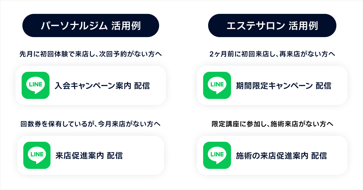 ・例) 初回の来店から14日が経過し、次回予約が入っていない方・例) 回数券の残回数が3回以上あり、直近30日間で来店がない方