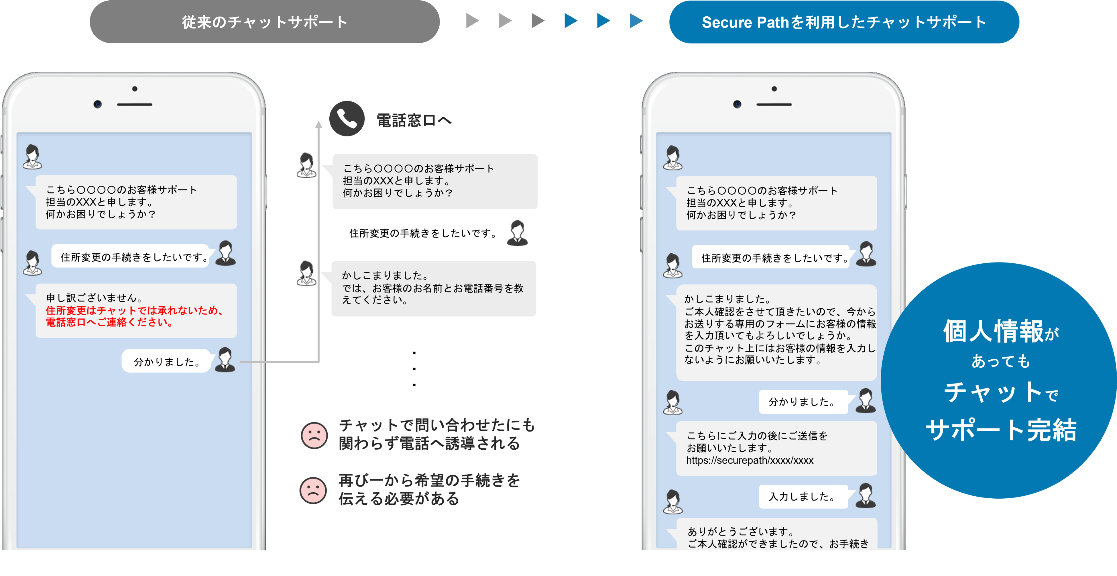 「Secure Path」はモビルスが独自開発した、セキュリティ・コミュニケーション機能です。Secure Pathを利用すると、WebやLINEでのチャットサポートにおいて、オペレータが顧客の個人情報を安全に受け取り、本人確認や個人情報に基づいた個別対応を行うことができ、チャットボットによる自動応答でも利用可能です。Secure Pathで取得した個人情報は、クレジットカード決済で求められるPCI DSS準拠認定されており、暗号化・保護によりそのデータ閲覧や管理についても厳しく制限されます。