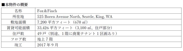 阪急阪神不動産株式会社(本社:大阪市北区、社長:諸冨隆一(※1))では、今般、アメリカで初めて不動産事業に着手することとしました。具体的には、アメリカに現地法人“Hankyu Hanshin Properties USA LLC”を設立し、同法人が、ワシントン州シアトル市の賃貸住宅「Fox & Finch」(以下、「本物件」)を取得することにより、不動産賃貸事業に取り組むこととします。