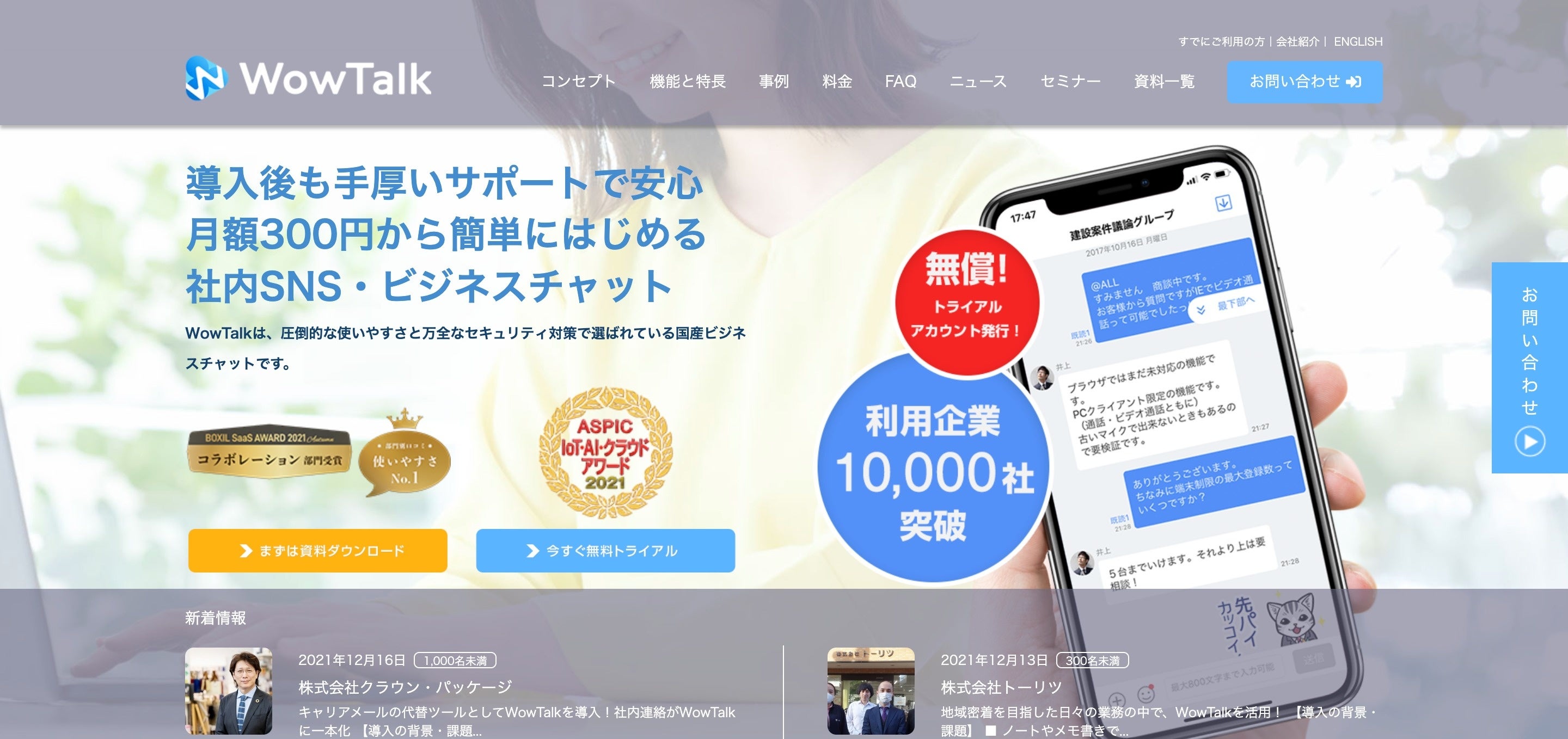 WowTalkは、企業の社員間でチャットや無料通話、社内SNSなどの機能を持った企業内チャットツールです。セキュリティ対策も万全の社内情報共有のツールとして様々なメリットを提供し、グループチャットによる社内コミュニケーション活性化を実現します。