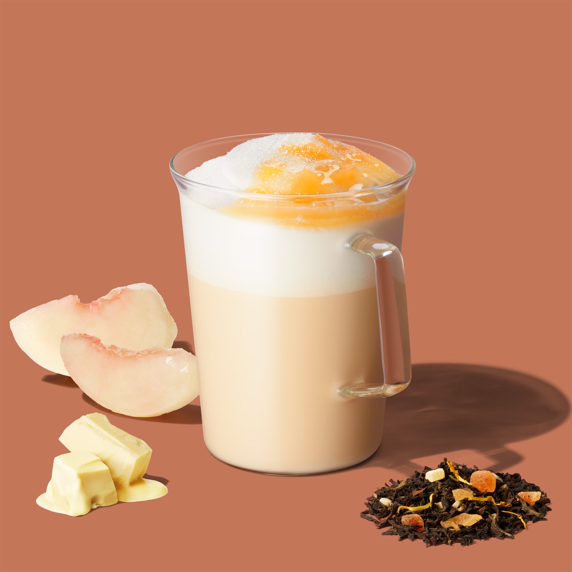 『ホワイト ピーチ & ジョイフルメドレー ムース ティー ラテ』は、「ジョイフルメドレー」にミルク、ホワイトピーチのフレーバーシロップを合わせたフルーティーさとティーの華やかな風味のティー ラテです。ふんわりとした口どけのティームースをトップにのせて、とろっとした甘さのホワイトピーチ果肉ソースとホワイトチョコレートパウダーで仕上げました。ホワイトピーチのやさしい甘さと表情豊かな「ジョイフルメドレー」※の味わいが口の中で溶け合い最後のひと口まで楽しめるティー ラテです。ホットとアイスの2種類からお選びいただけます。
