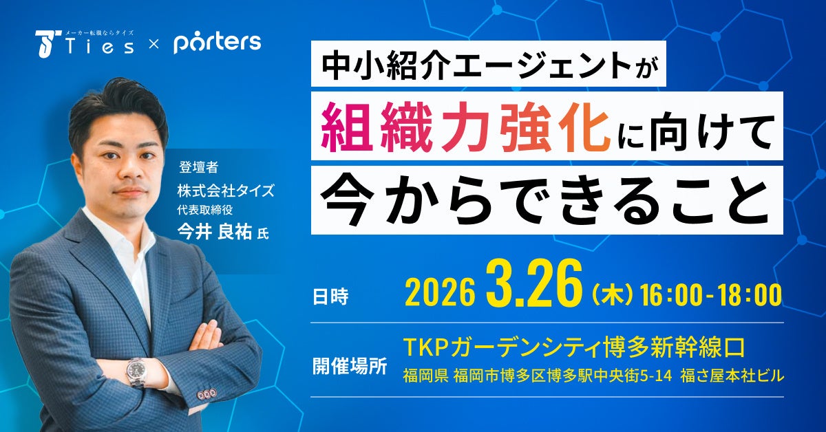 人材ビジネス向けマッチングシステムを提供するポーターズ株式会社(東京証券取引所グロース.証券コード5126、東京都港区、代表 西森 康二)は、株式会社タイズにて代表取締役を務める今井良祐氏をお招きし、「中小紹介エージェントが組織力強化に向けて今からできること」と題した無料のオフラインイベントを2026年3月26日(木)16:00~18:00に福岡にて開催します。