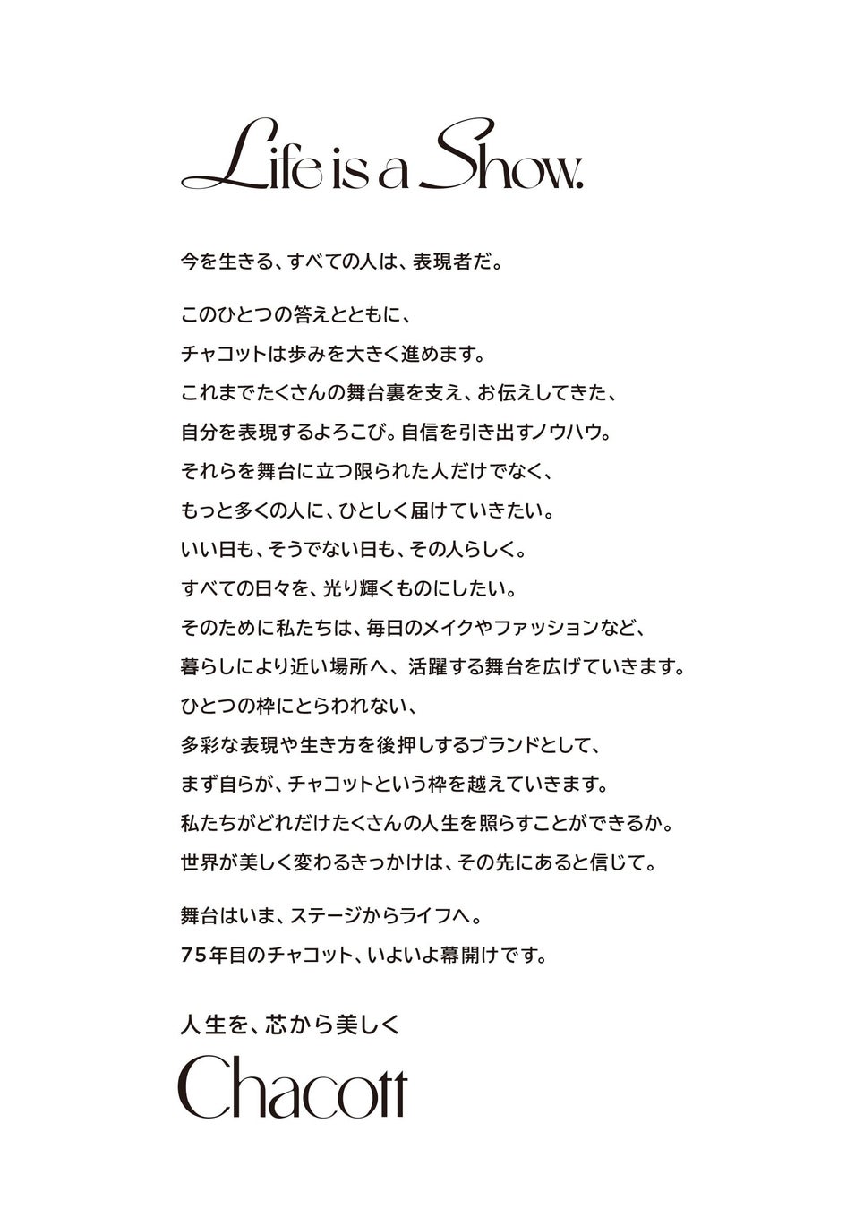 この度、創業75周年を迎えるにあたり、ブランドフィロソフィー「人生を、芯から美しく。」をより具現化するために、キャンペーンスローガン「Life is a show.」を掲げ、芸術文化を支え続けてきた専門性はそのままに、“美しくありたい”と願う生活者に向けて、より多くの接点を設けてまいります。