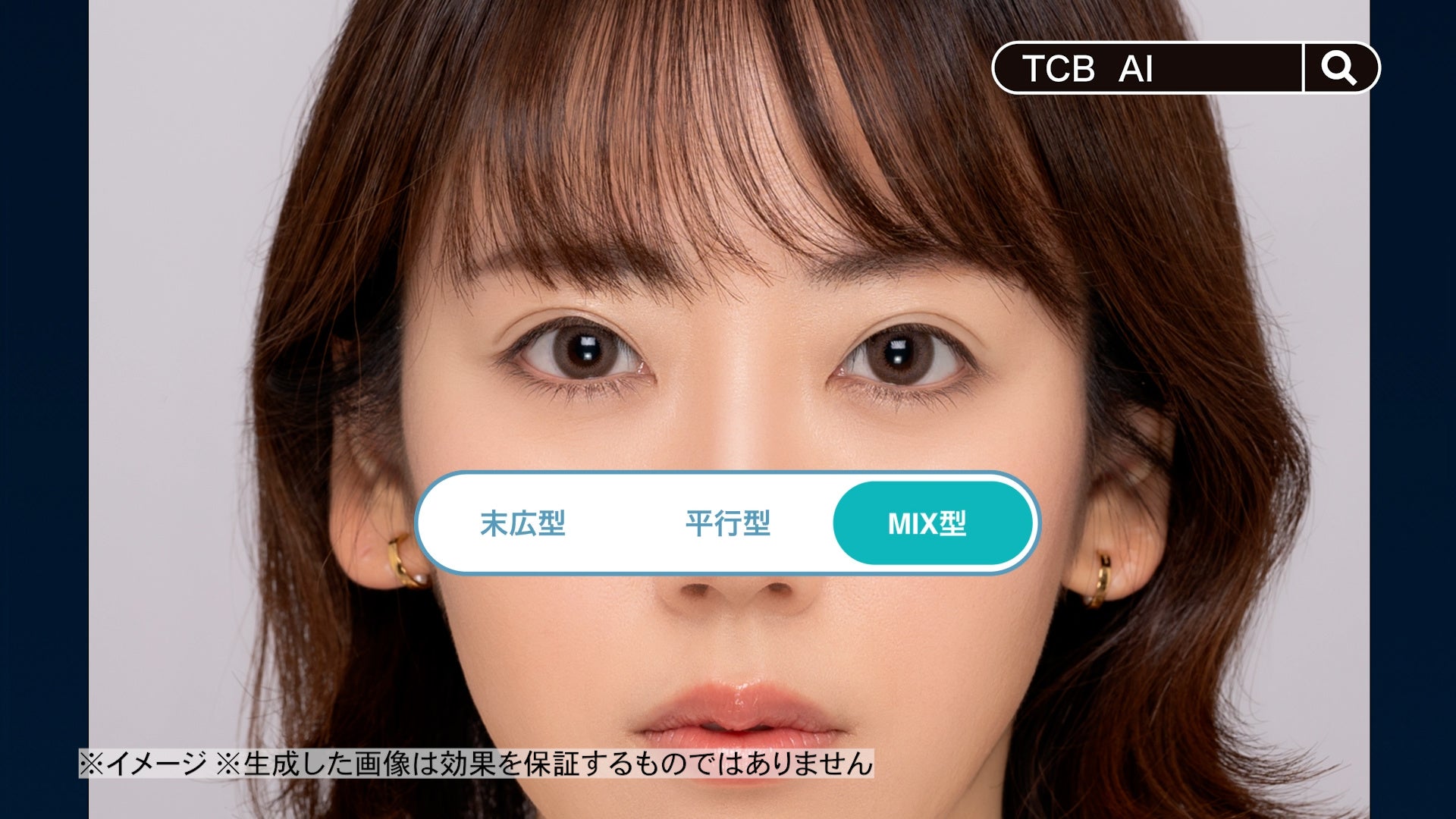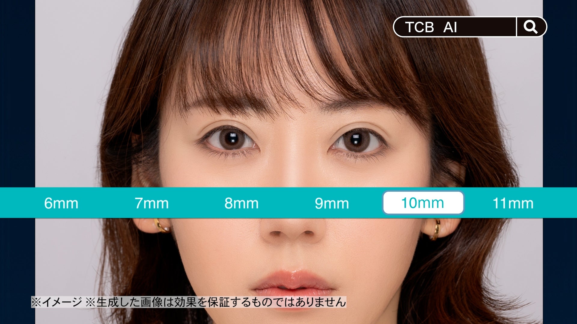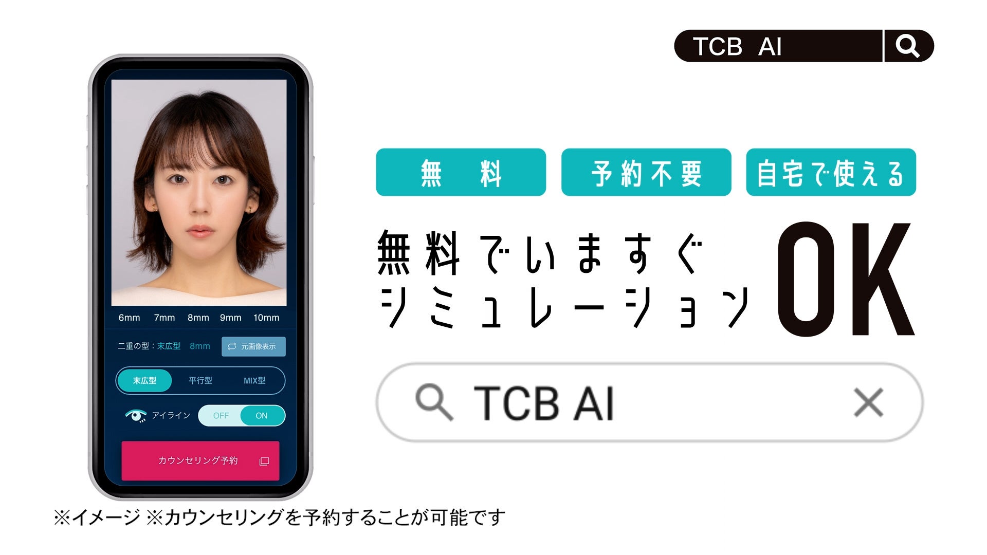 「美容医療は、ファッションへ。」のキャッチフレーズとともに、TCBのCMの象徴ともなっている二重術シミュレーション。これまではクリニックでのカウンセリングの際にアナログ的な手法で行っていましたが、この度、10万件以上に及ぶTCBの症例実績を活かしてAIシミュレーターを開発。来院せずとも自宅などでスマホで撮影した写真を用いて、誰でもお手軽に二重術の仕上がりをシミュレーションすることが可能となりました。カウンセリング予約も不要で、どなたでも無料でお使いいただけます。