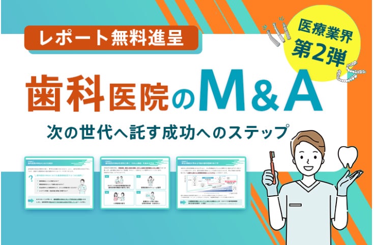 近年、歯科医師の高齢化や患者数の減少などを背景に、歯科医院の経営環境は厳しさを増しています。 事業承継を検討される先生も増加する一方、後継者不足や経営の不安など、多くの課題に直面している現状があります。M&A Onlineはこのような課題を抱える歯科医院経営者様を支援するため、M&Aに関する基礎知識から、歯科医院のM&Aにおける注意点、成功事例、活用メリットなどをまとめた資料を作成いたしました。