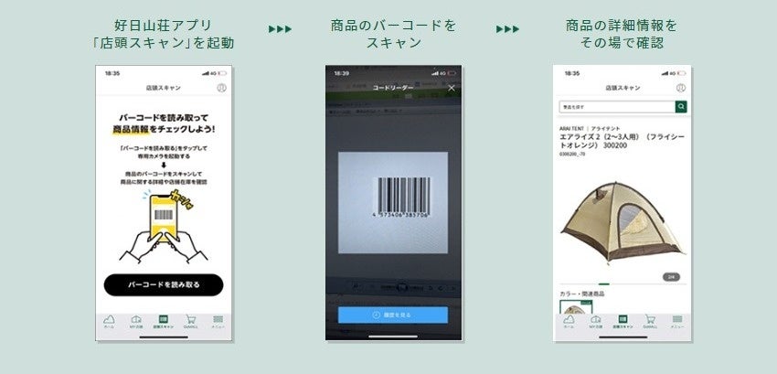 好日山荘アプリで店頭商品のバーコードをスキャンすると商品詳細をご確認いただけます。