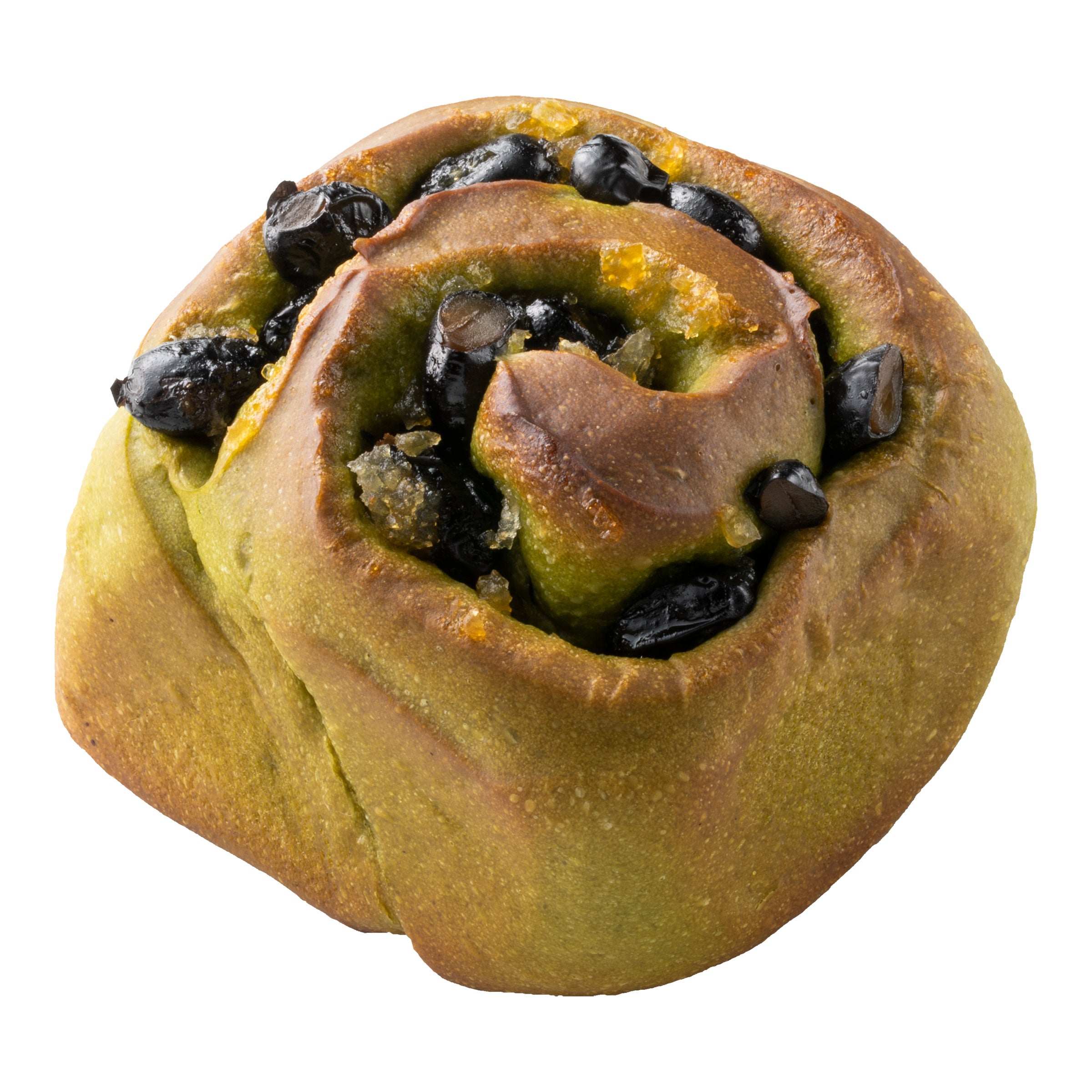 宇治抹茶のパン生地に洋酒漬柚子ピールと黒豆甘納豆をたっぷり巻き込みました。