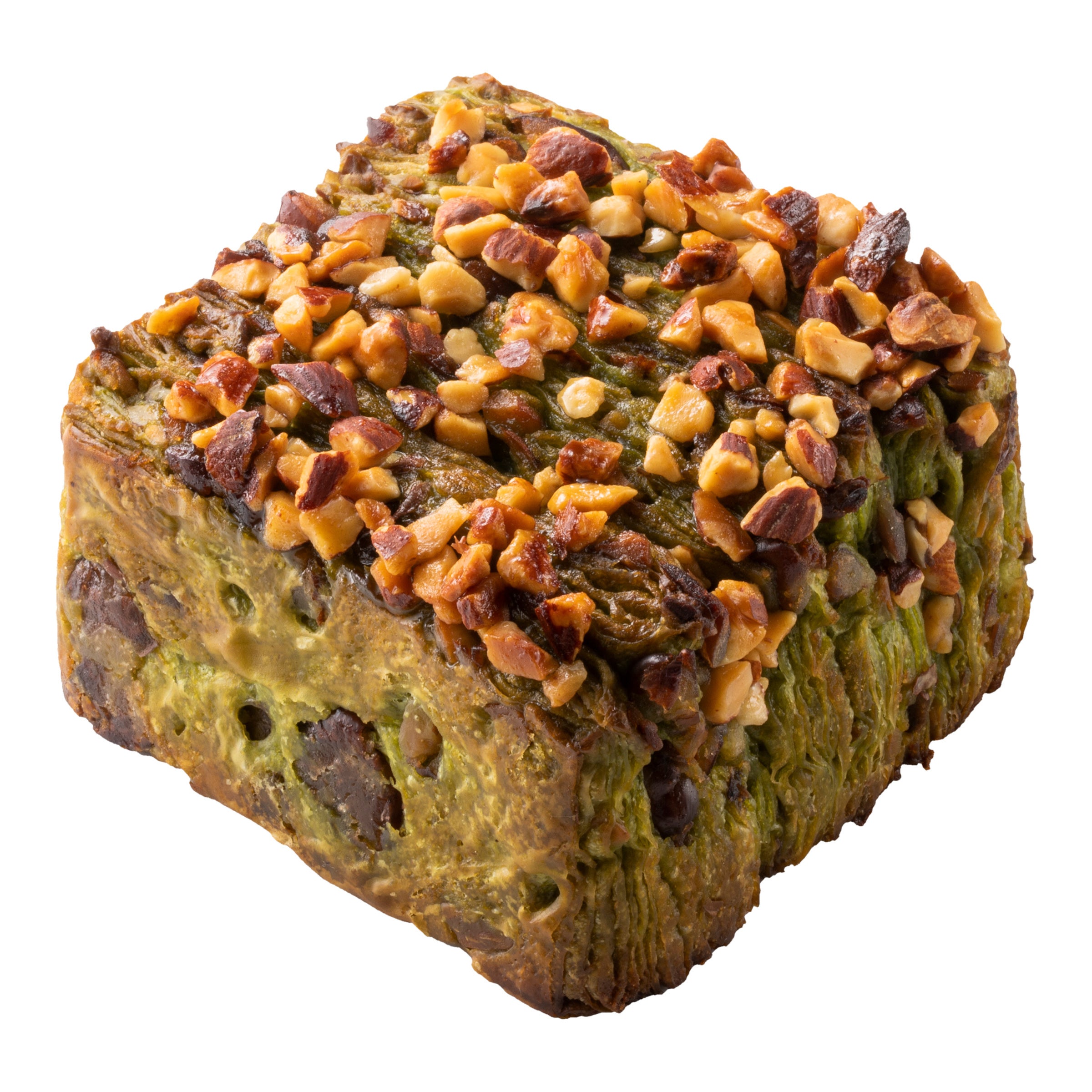 宇治抹茶のデニッシュ生地に大納言甘納豆と、食感のアクセントにアーモンドダイスを混ぜ込み、さらに飴がけアーモンドダイスをトッピングしました。