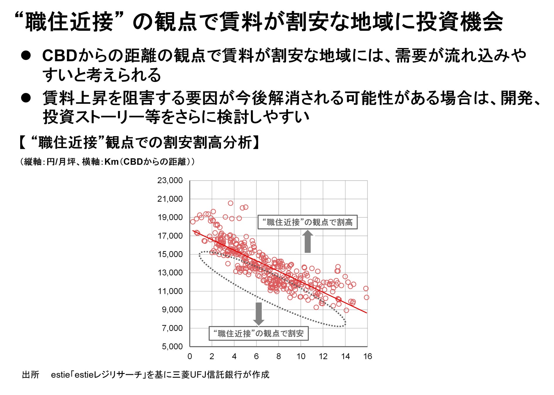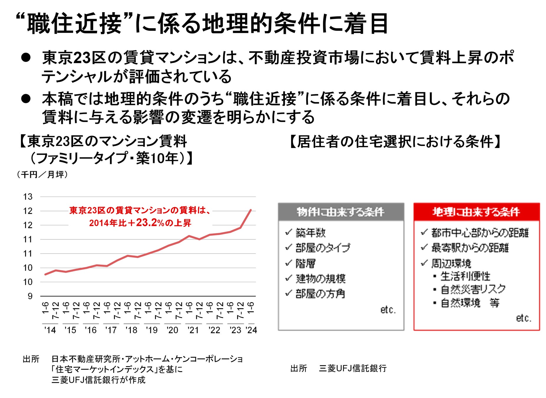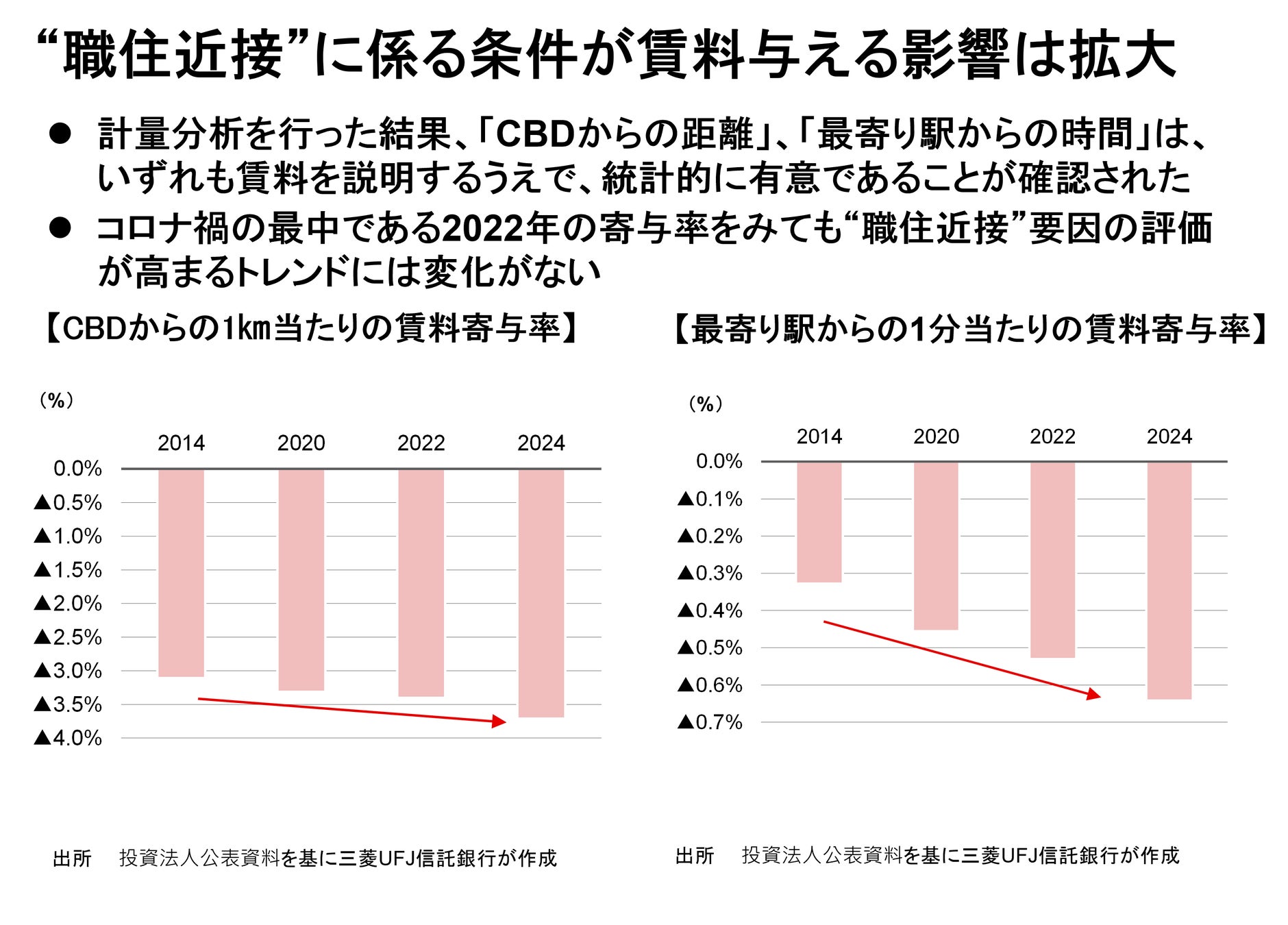 J-REITの保有物件を対象とした計量分析にて、「CBD(中心業務地区)からの距離」、「最寄り駅からの時間」という“職住近接”に紐づく2つの地理的条件によりマンション賃料にもたらされるプラスの影響が、過去10年間で拡大していることが明らかになった。