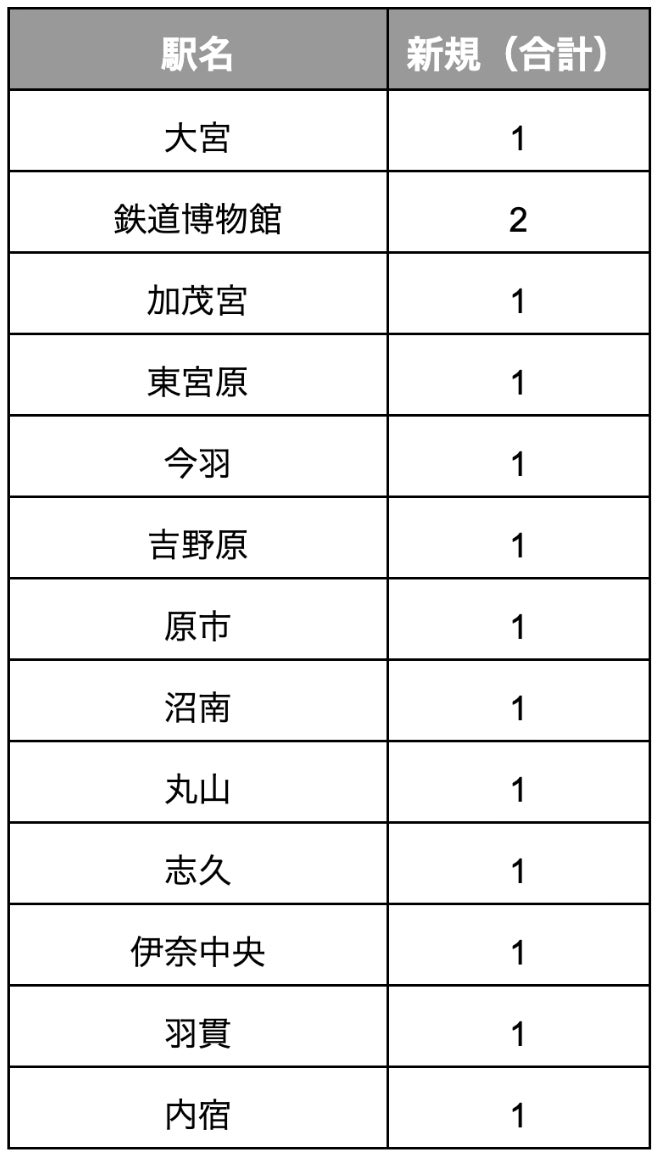 ● 埼玉新都市交通伊奈線(愛称:ニューシャトル):13駅(計14か所)