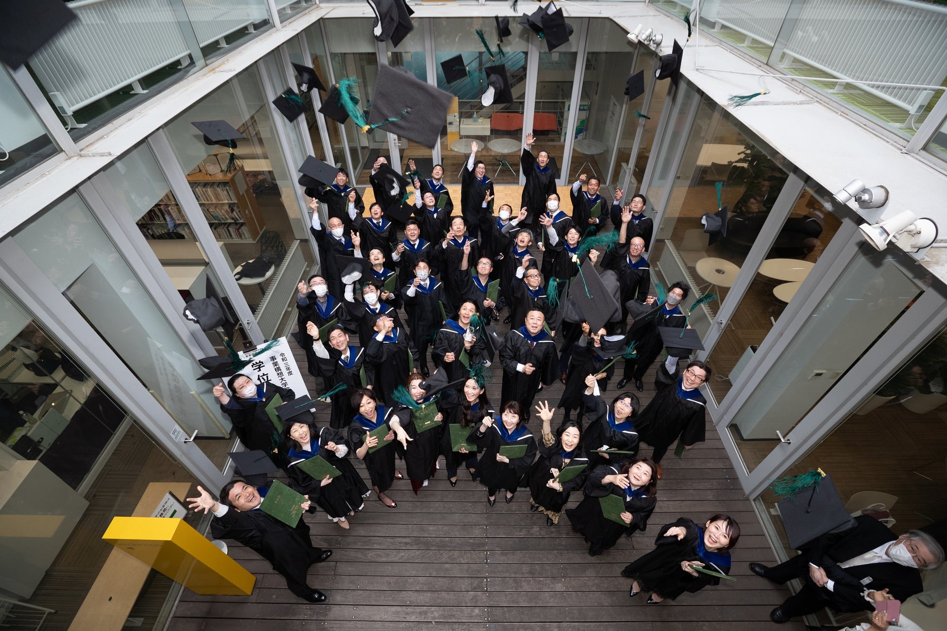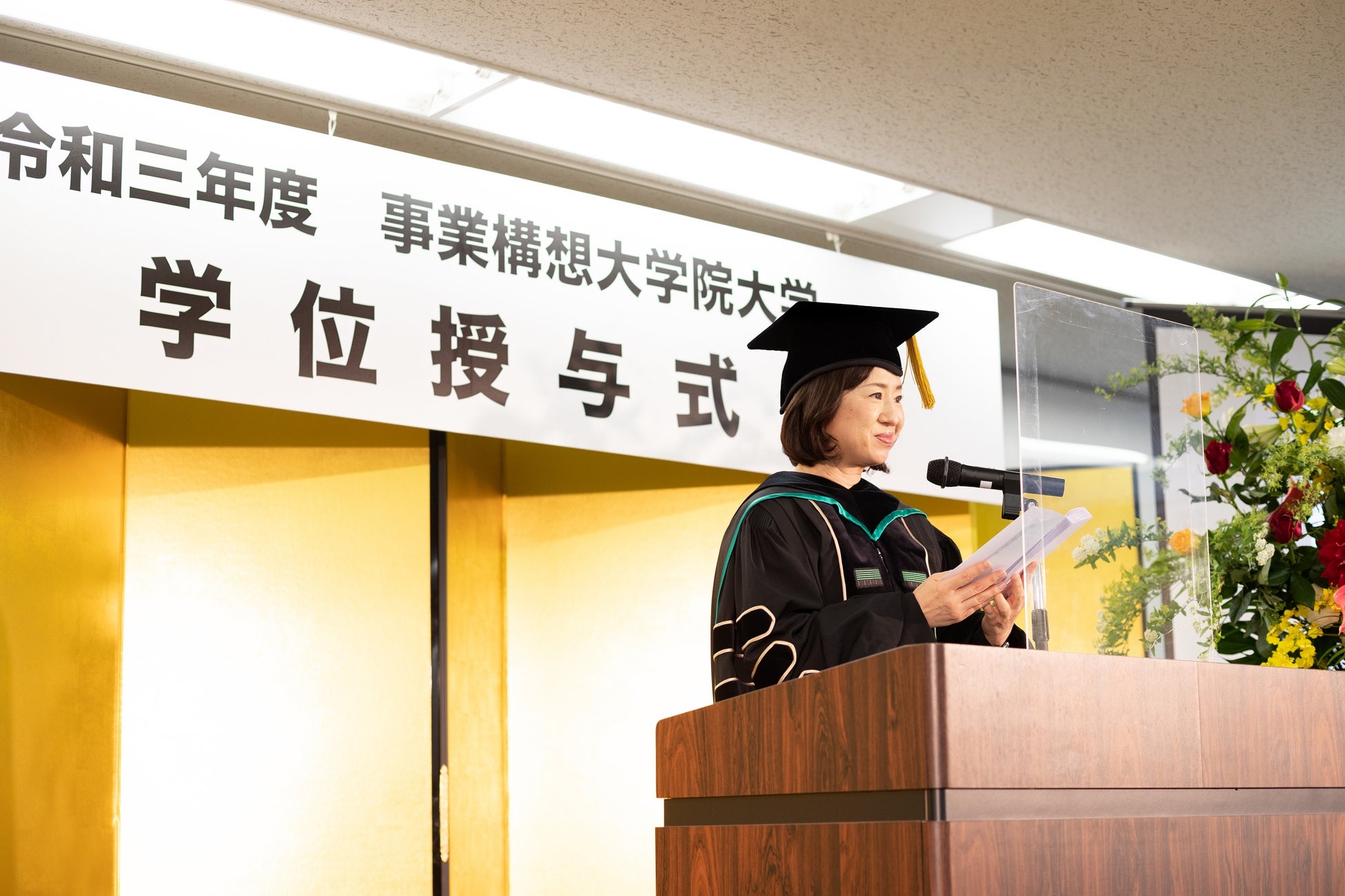 「本日ここに105名の事業構想修士が誕生します。学校法人先端教育機構の理事・評議員、教職員一同を代表し、心からのお祝いを申し上げます。入学当時を振り返りますと、未知のコロナウイルス感染症が猛威をふるい、暮らしの面、仕事の面において、世界中が厳しい環境に直面をしました。さまざまなことが中止、停滞、延期される中で、不安ばかりが増幅し、重い空気が漂っていたことが思い出されます。本学での研究を決意し、入学された9期の皆さんは、誰かがやらねば社会は変わらない、抱える課題を事業構想で解決していこう、自分自身の可能性を高めてみよう、と新たな一歩を踏み出しました。そして、それぞれの理想を掲げて、2年間立派に研究を成し遂げました。事業構想大学院大学はおかげさまで10年の節目を迎え、ここにご一緒の事業構想修士の皆さんと共に、また新たな一歩を踏み出します。構想と構想計画を考え続ける皆さんが、社会の主役となり、これからも、本学の校風とも言える前向きな構え、仲間の笑顔、賞賛の拍手、親身な助言、背中を押す勇気を糧に、チャレンジを続けてください。修了生の皆様が、それぞれの可能性をさらに広げていかれますことを祈念し、心よりお祝いを申し上げます。」