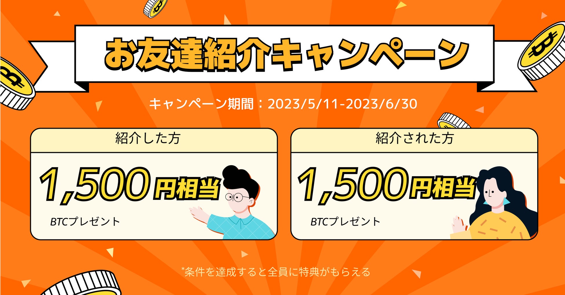 キャンペーン期間中にお友達を紹介し、紹介されたお友達が新規登録、口座開設を完了すると、1人につき1,500円相当のBTC*をプレゼントいたします。