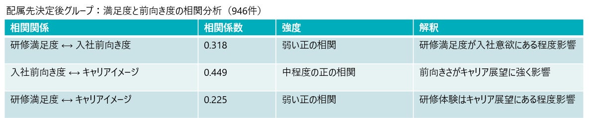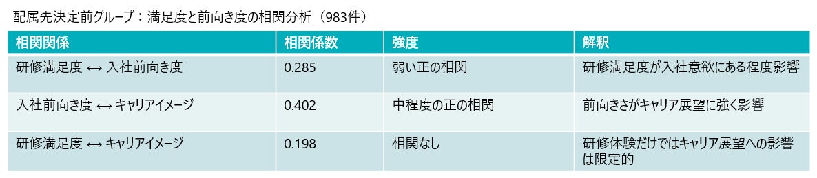 特に、「入社への前向きさ」と「キャリアイメージの明確さ」の関連性が高まっており、配属先が明確になった後の研修は、実際の業務と結びついた学びを通じて、将来のキャリアをより具体的に描けるようになっていることが示されています。