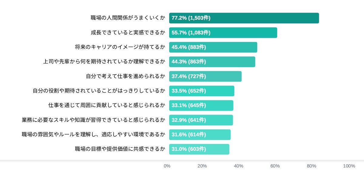 この結果から、新卒社員が働くうえで重視しているのは、良好な人間関係の中で成長を実感できる環境であることがうかがえる。