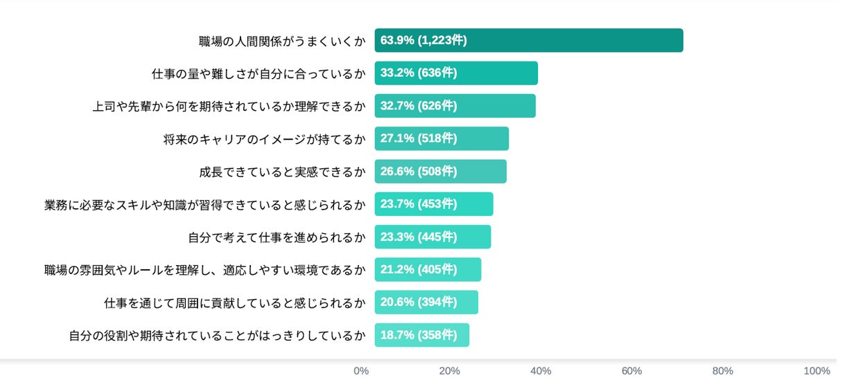 配属後に抱いている不安要素として最も多く挙げられたのは「職場の人間関係がうまくいくか」で、63.9%を上回った。これは、前向きに働くために必要な要素としても1位に挙げられており、新卒社員にとって人間関係が心理的に非常に大きな比重を占めていることが明らかである。