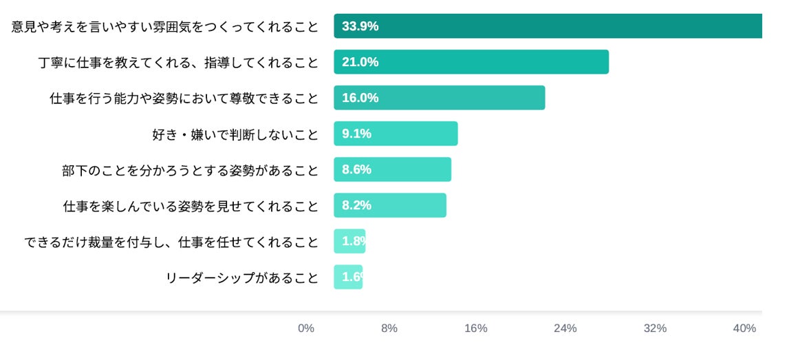 上司・先輩に最も求めるのは、「意見を言いやすい雰囲気(33.9%)」で、「丁寧に仕事を教えてくれる、指導してくれること(20.9%)」や「仕事を行う能力や姿勢において尊敬できること(16.0%)」を上回り、指導的な関係性よりも対話・コミュニケーションを重視する関係を求めている傾向が示されています。