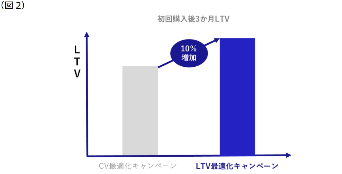 開発段階での検証において、従来のCV最適化キャンペーンと、今回新たに開発したLTV最適化キャンペーンのLTVを、過去出稿データを用いて比較したところ、初回購入後3か月LTVは約10%増加しました(図2)。