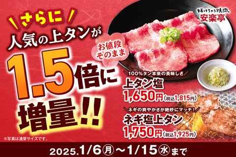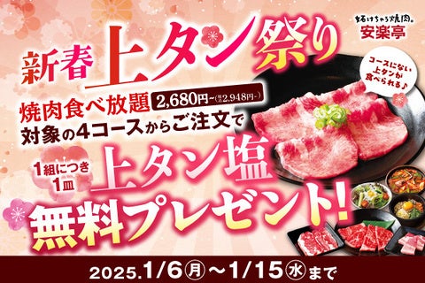 【新春企画 安楽亭の上タン祭り開催!】食べ放題(対象は4コース)のご注文で1組1皿上タン塩を無料プレゼント! さらに、単品の上タン塩とネギ塩上タンが、いつものお値段で1.5倍に増量!!