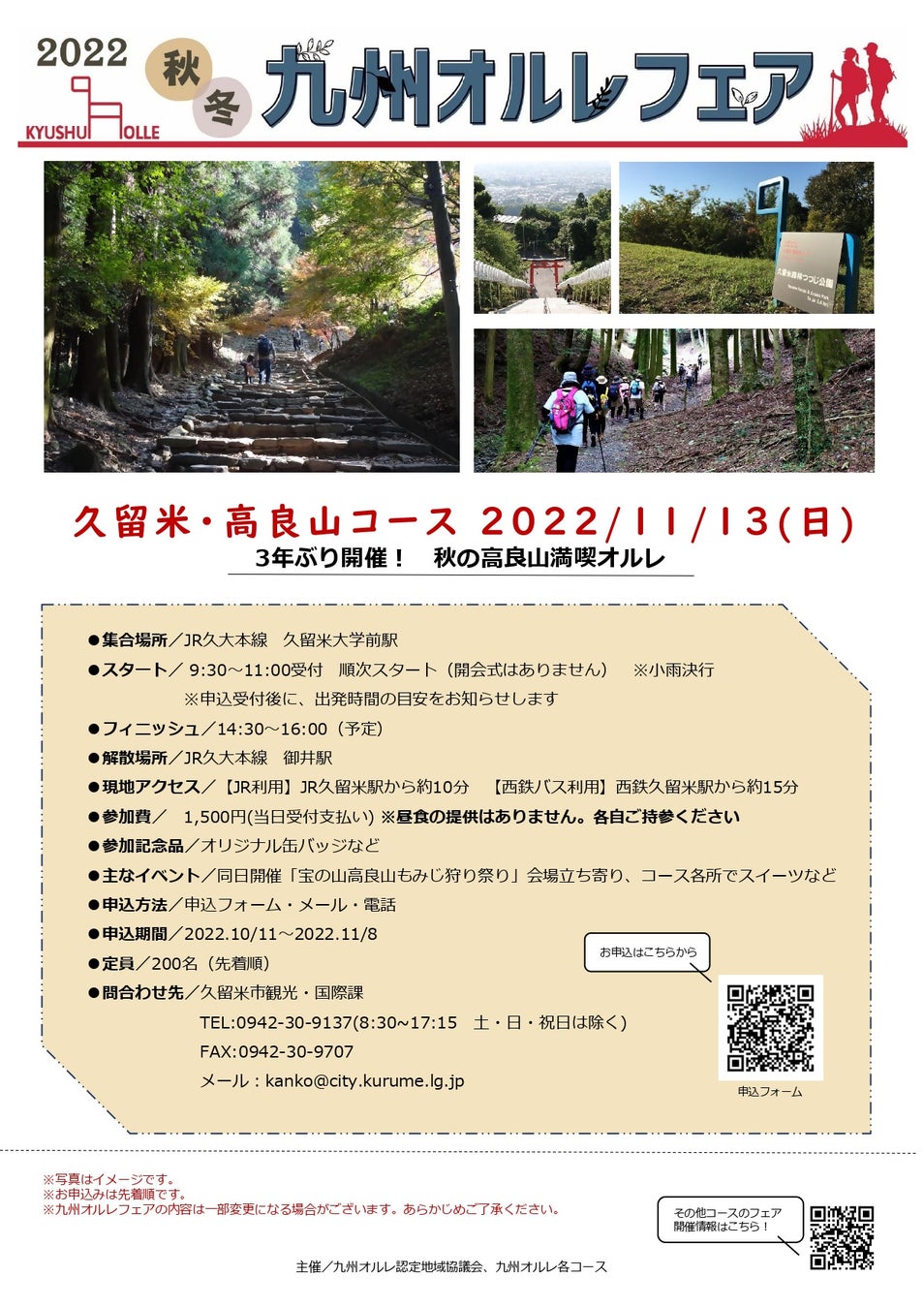 九州オルレ「久留米・高良山コース」では、3年ぶりにオルレフェア「秋の高良山満喫オルレ」を開催します。