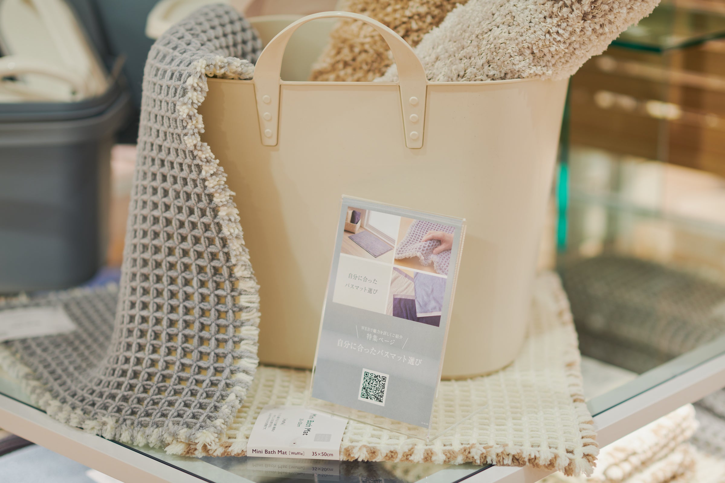 公式オンラインショップ内で課題解決につながる商品特徴を伝える「特集ページ」づくりを強化してきました。銀座店では店内から特集ページに直接つながることができるQRコード付きPOPを設置し、手に取った商品のさらなる魅力が見つかるようにします。