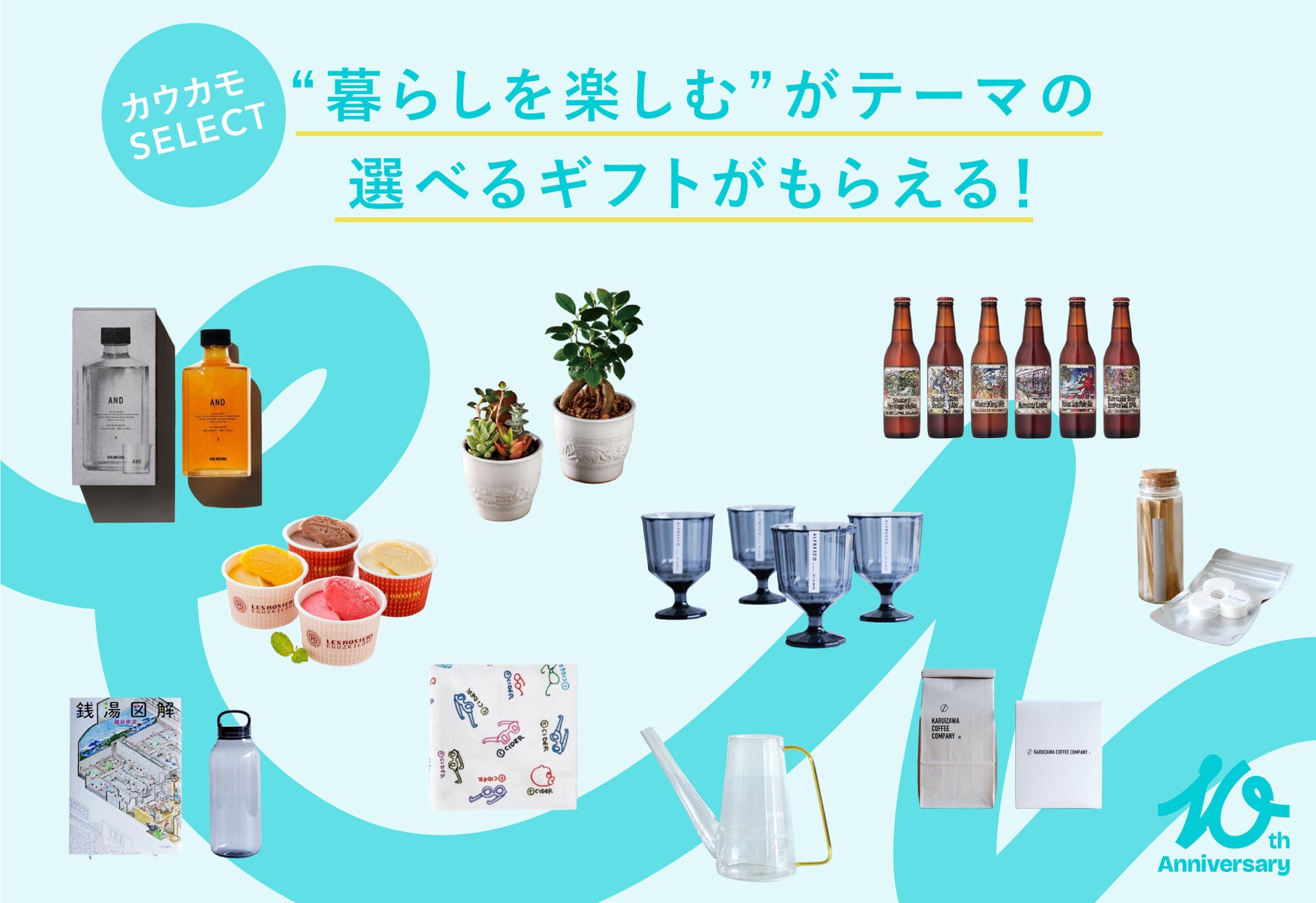 さらに期間中は、「カウカモ中古マンション購入セミナー」または「中古リノベ見学会」のいずれかにご来場いただいた方を対象に、カウカモ10周年を記念して特別にセレクトした“住まいにまつわるギフト”全10種類の中から、お好きなギフトを1つプレゼントします。