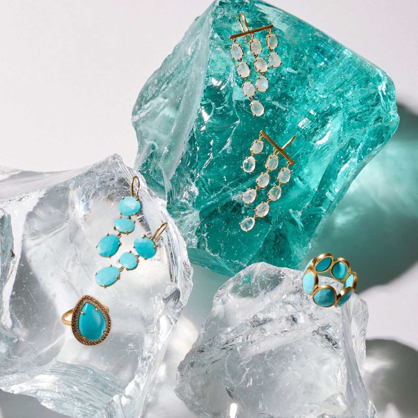 インド ジャイプールの熟練の職人が一つずつ丁寧に製作し、エレガントで洗練されたデザインが人気の<マグノリア トゥエルブ>。現在、バーニーズ ニューヨークのみでのご紹介となるエクスクルーシヴブランドです。今回は、“世界で最も美しいターコイズ”と評される、スリーピングビューティターコイズを使用した一点物のリングやピアスなど、新作コレクションが登場。混じり気のない美しい青色が特徴です。そのほかにも、夏らしい爽やかなカラーリングの天然石をあしらったアイテムが一堂に揃います。