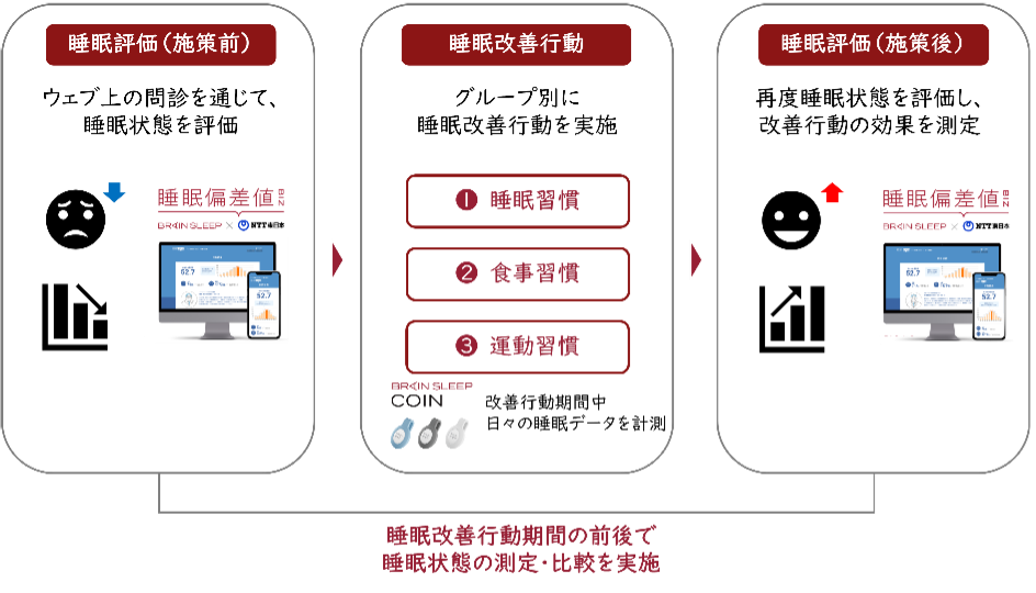睡眠状態の評価は、客観的指標としてブレインスリープ コイン*2で測定、主観的指標として睡眠偏差値for Biz*3を用いて実施しました。