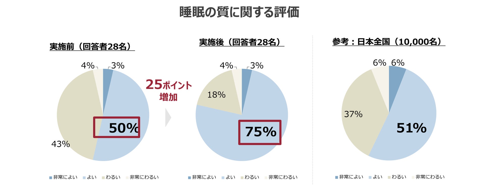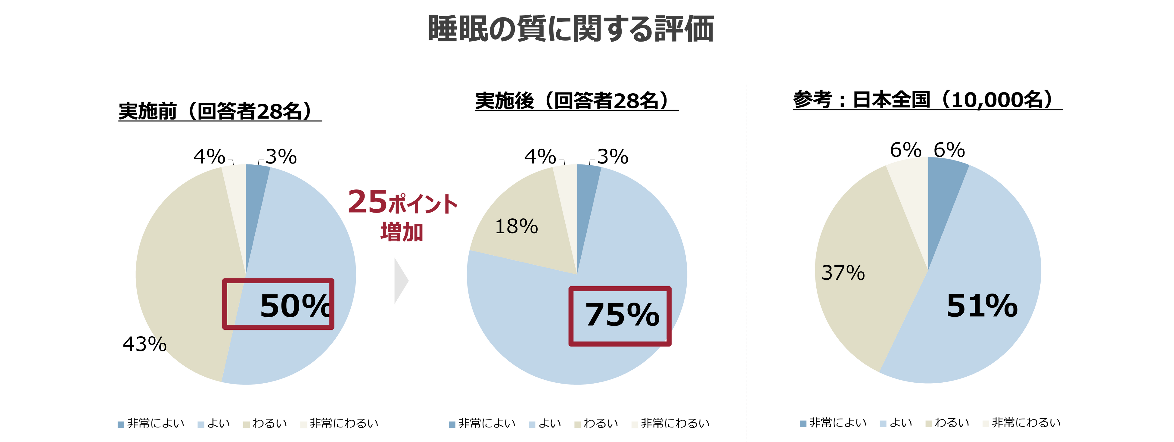 実施前の睡眠の質と比較して、自身の「睡眠の質が良い」と答えた方は25ポイント増加し、日本全国を超える結果となりました。